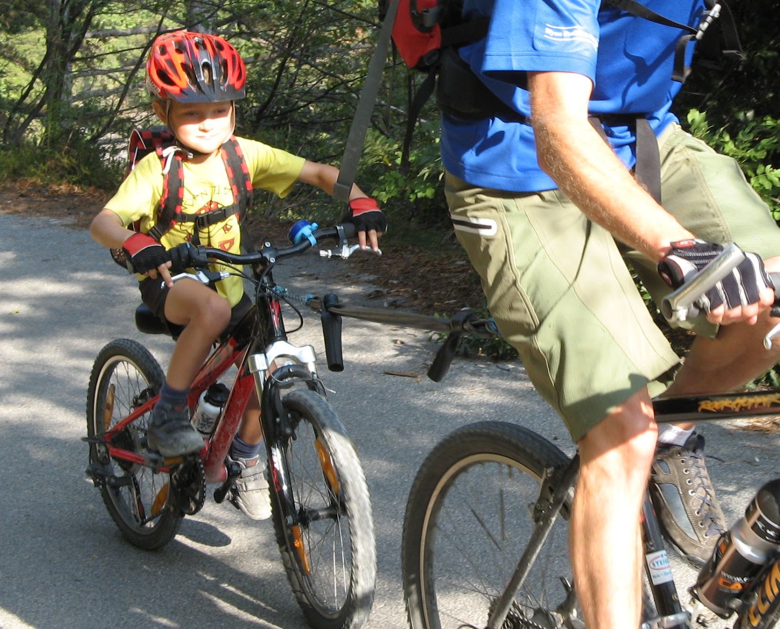 Ein Reepschnurstück werden am Lenker des Kindervelos angebunden. Die beiden anderen Reepschnurstücke binden wir an den beiden Enden des Schlauches an. Vor der Abfahrt wird der Schlauch nun am Erwachsenenvelo angebunden und mit einem Skiriemen oder ähnlinchem festgemacht. Ist nun eine Abschleppaktion fällig, klicken wir den Karabiner ein und verbinden mit dem Schlauch mit dem Kindervelo: