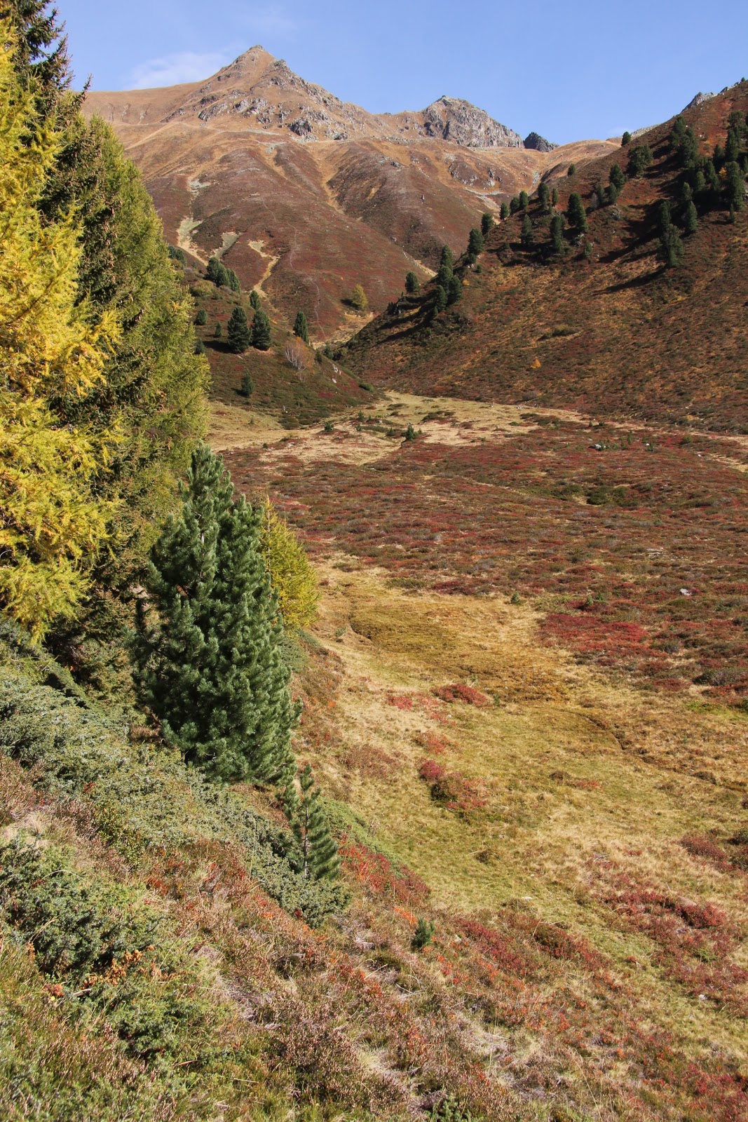 Von der Tällifurgge stiegen wir nach Sertig ab. In allen Herbstfarben leuchtete uns das Tal entgegen. Das Rot der Heidelbeersträucher, das Gelb der Lärchen und Birken, das Dunkelgrün der Arven, das Gras leuchtet in allen Braun-, Grün- und Gelbtönen. Wahrlich verschwenderisch, wie hier die Farben prangen. Da wird geklotzt, nicht gekleckert.