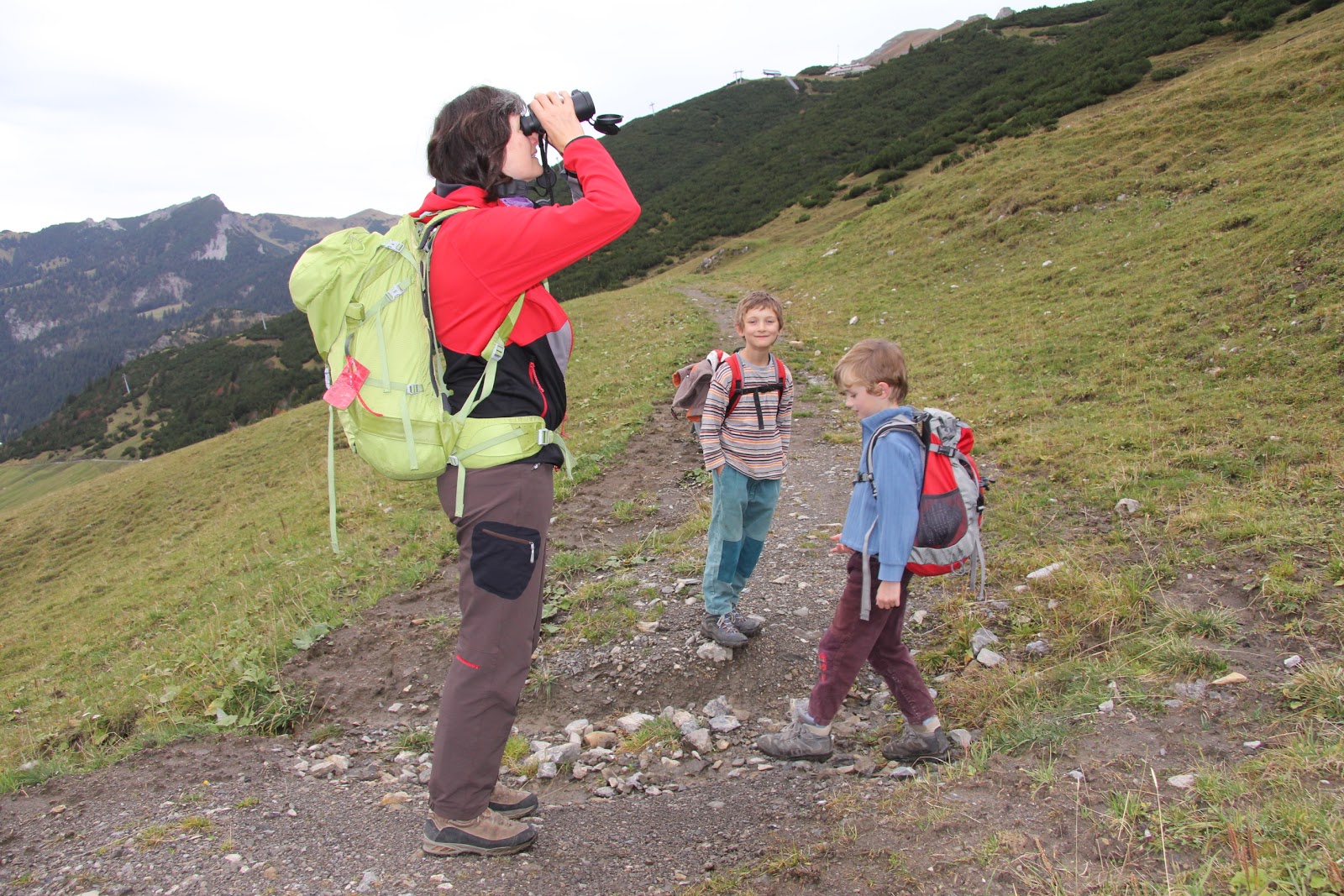 Am nächsten Morgen starteten wir Richtung Augstenberg, die Wetterzeichen sahen (noch) nicht allzu schlecht aus. Der Weg führte zuerst über Alpweiden, dann durch Bergföhrenwald und Lawinenverbauungen. Bergföhren unterscheiden sich von Arven dadurch, dass zwei Nadeln zusammen dem Ast entwachsen, bei der Arve sind es fünf. Später, auf dem Grat, wurde es aber immer dunkler. Im Rheintal zog eine Regenfront auf. Wir planten kurz um und bestiegen den Spitz, der quasi am Weg liegt, damit wir trotzdem noch einen Gipfel gemacht haben.