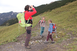 Auf der Tour konnten wir verschiedene Tiere beobachten. Vom Chalbergrad sahen wir zuerst nur wenige Gämsen. Im Sattel beim Spitz waren dann aber über 40 Tiere auszumachen! Schon im Aufstieg über Turna beobachteten wir drei Gesellen, die uns beobachteten: Murmeltiere. Jetzt im Herbst waren sie besonders dick, sie haben sich einen ordentlichen Winterspeck angefressen. Die putzigen Tierchen haben kein einfaches Leben. Sie leben in Sippen, wobei sich nur der Sippenchef und die -chefin fortpflanzen. Sie werden auch Bär und Katze genannt, die Jungen Kätzchen oder Äffchen. Während des Sommers müssen sie sich soviel Speck anfressen, dass sie den Winterschlaf von Oktober bis April überleben. Steigt allerdings die Temperatur im Sommer über 20° C, geraten sie bereits in Hitzestress, da sie weder schwitzen noch hecheln können. Sie verkriechen sich dann in ihre Bauten, die bis 7 Meter unter die Erde reichen, und warten die kühlere Tageszeit ab. Fühlen sie sich bedroht, pfeifen sie. Bei allgemeiner Gefahr wird mehrmals gepfiffen, bei Gefahr aus der Luft, vor allem von Adler, genau einmal.