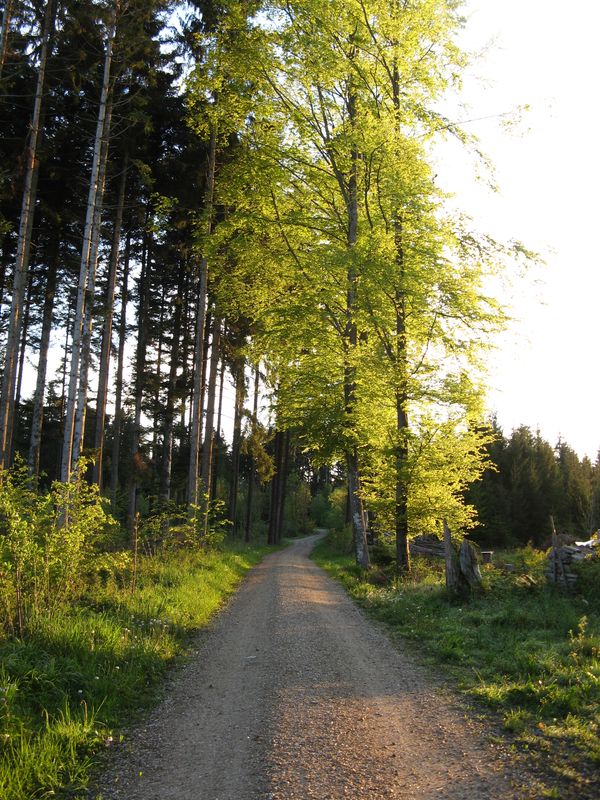 Singdrossel und so weiter. Ein wahres Konzert. Idylle pur. Immer wieder querten Tiere meinen Weg: Hasen, Füchse, Dachse und so weiter. Mit den Rehen war ich per Du, die flohen schon gar nicht mehr, sondern glotzten mich an und trotteten gemächlich weiter. Ich glotzte jeweils zurück.