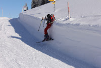 Nun stand uns das Beste bevor: Die Abfahrt in herrlichem Pulverschnee. Ich fuhr voraus, unsere zwei Kinder sofort hinterher. Viel zu schnell waren wir bei einer Alphütte, wo wir die zweite ausgiebige Rast einlegten.