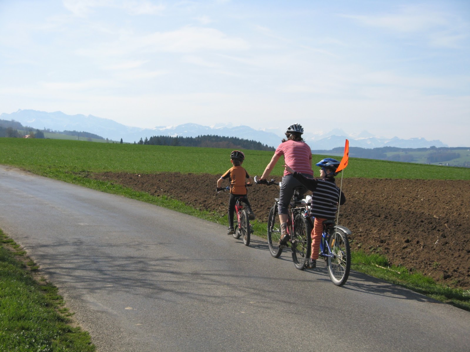 Rund um das Dorf dominieren Obstkulturen das Bild. Dass wir so gemütlich über die Felder rollen können, haben wir dem Reussgletscher zu verdanken, der auf seinem Rückzug die rundgeschliffenen Hügel und die beiden Seen hinterliess.