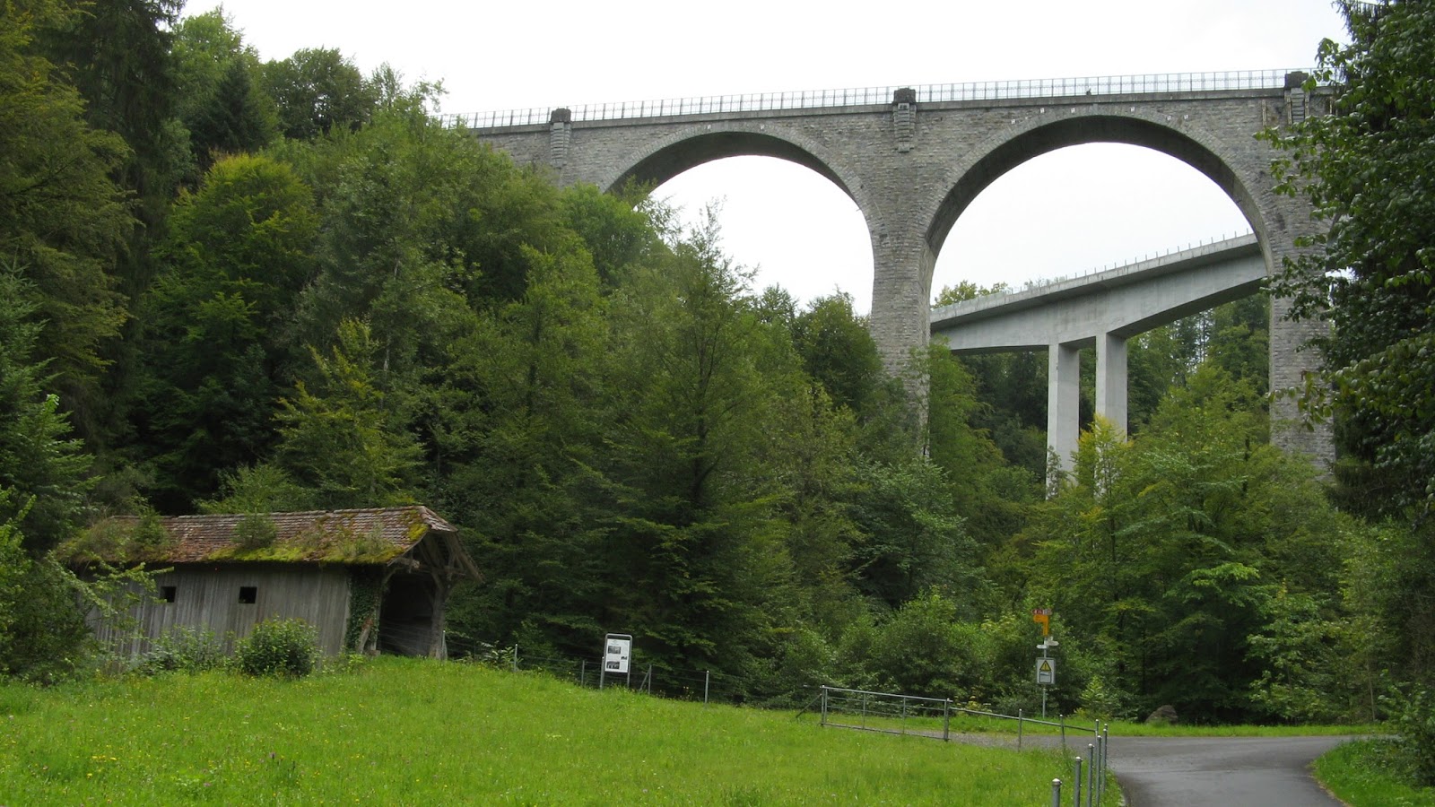 Ab Unterägeri können wir der Nationalen Route 9 „Seen-Route“ folgen, müssen aber auf der Hauptstrasse fahren. Diese verlassen wir nach Neuägeri. Wir fahren nun im Lorzentobel und dem namensgebenden Fluss entlang. Die Lorze hat sich hier tief in die Molasse eingefressen. Drei Brücken überspannen den Bach oder gleich das ganze Tal. Die erste Brücke wurde bereits 1531 nachgewiesen und 1759 ersetzt. Sie besteht heute noch. Die ab 1910 erstellte Steinbogenbrücke diente der Bewältigung des gestiegenen Verkehrsaufkommens. 1985 wurde eine weitere Brücke erstellt, diesmal in Beton.