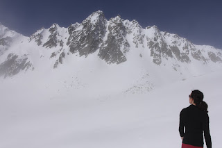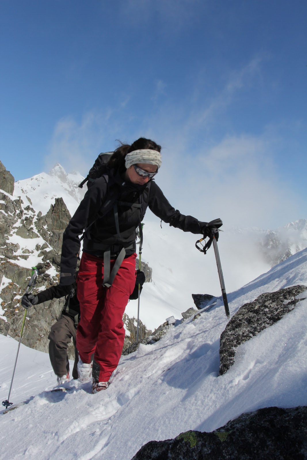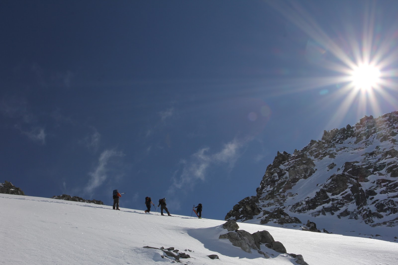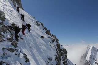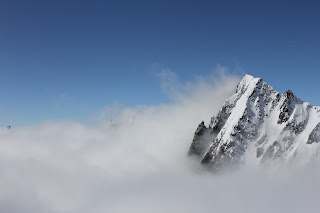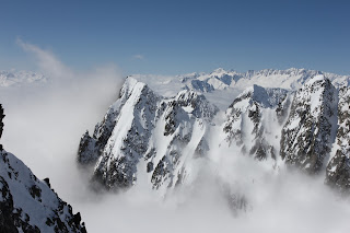 Steile Schneefelder waren zu erklimmen, unter uns gähnende Leere. Auf ziemlich genau 3000 Meter entschloss sich der Tourenleiter zur Umkehr, da er das weitere Vorgehen mit der ganzen Gruppe nicht mehr verantworten konnte. Nur die Versiertesten kämpften sich bis zum Gipfel auf 3076 Meter durch. Wir genossen derweil die Aussicht in die Berner Alpen, auf den Titlis und ins Wallis sowie das Tessin. Die Nebelgrenze war immer noch sehr hoch und sie schien wieder zu steigen.