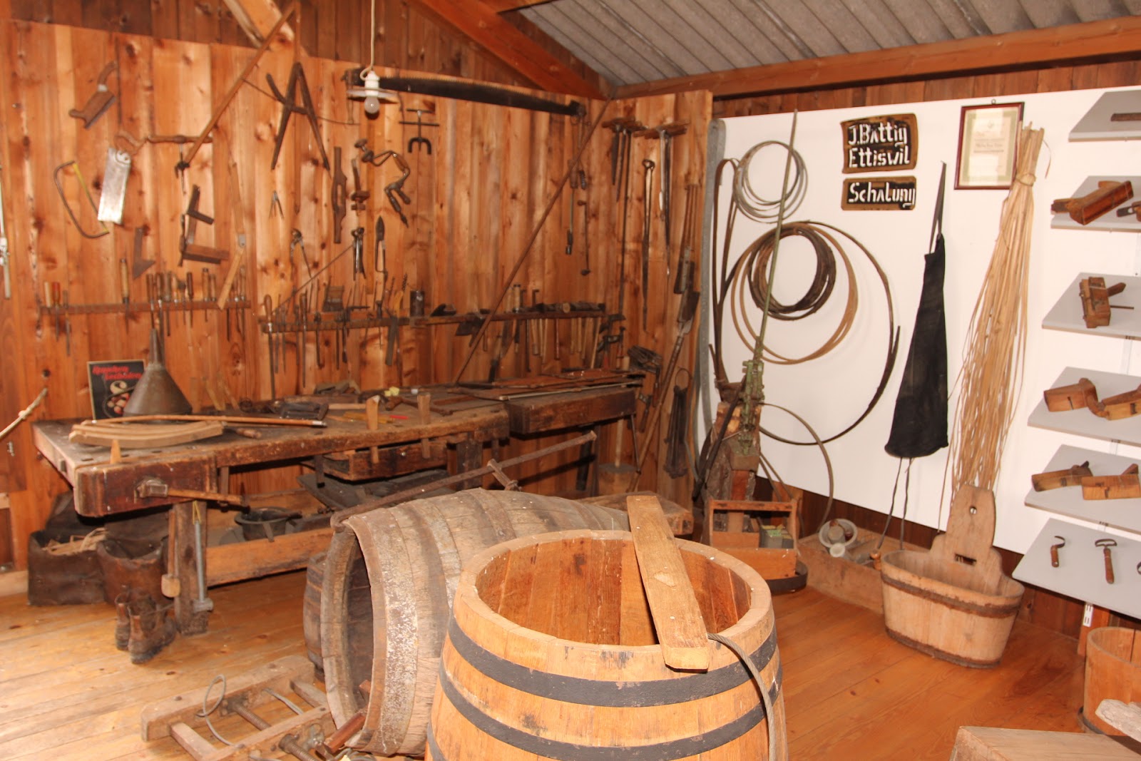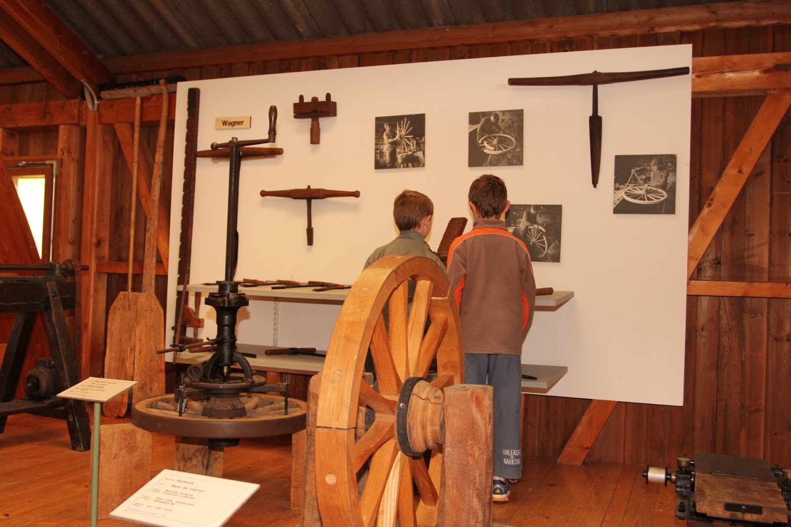 Im oberen Stockwerk werden Handwerke vorgestellt, von denen wir heute kaum mehr eine Vorstellung haben: Drechsler, Wagner, Schindelmacher, Küfer, Korbmacher. Oder wer weiss noch, was ein Häftlimacher ist? All diese Berufe werden vorgestellt mitsamt den verwendeten Werkzeugen. Zum Teil sind auch wieder Modelle der ganzen Anlage zu bewundern, zum Beispiel beim Schmied oder beim Zimmermann. Weiter hinten in der Halle sind verschiedene Pflüge zu bestaunen.