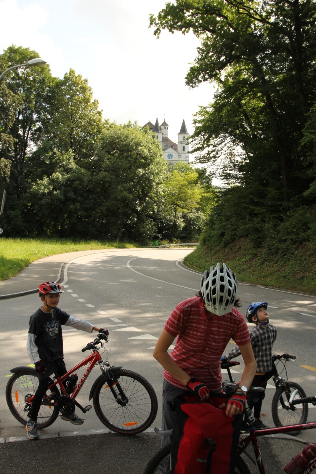 Wir aber fahren den Wegweisern der Route 8 entlang, vorbei an der Altstadt. Überrascht stellen wir fest, dass die noch ganz hübsch aussieht. Bis jetzt kannten wir ja nur den Bahnhof... Nach der Stadt fahren wir der Aare entlang, kriegen aber nicht wirklich etwas zu sehen davon, da dichtes Buschwerk den Blick versperrt. Dafür lässt es sich gemütlich und autofrei nach Aarburg rollen. Dort thront auf einem Felsen die Festung Aarburg, die heute ein Jugendheim ist.