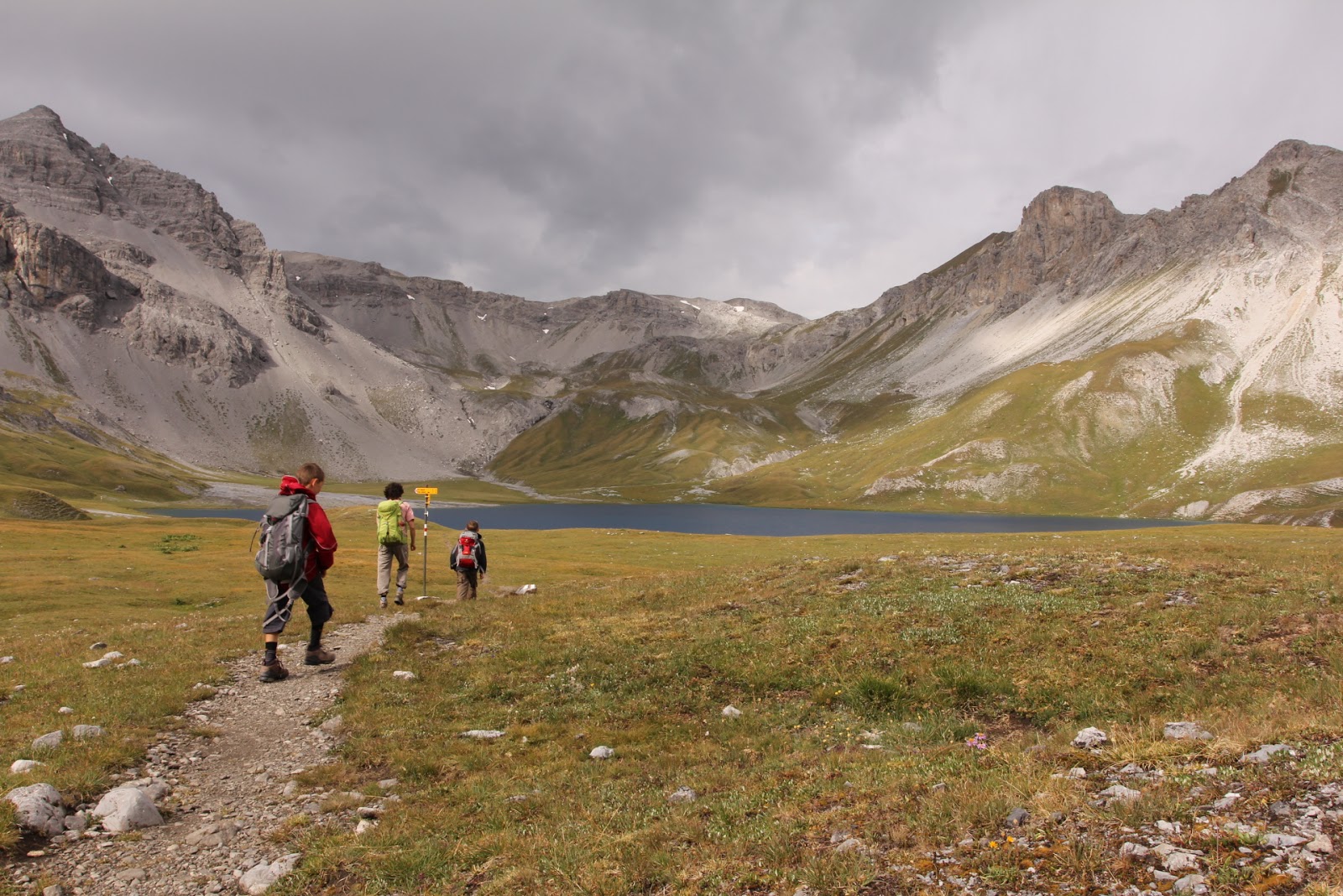 Nun standen uns noch 700 Höhenmeter bevor. Starker Wind kam auf, der uns manchmal fast umwarf. Die Kinder fanden es lustig, ich machte mir einzig Sorgen wegen Gewitter, von denen aber keine in Sicht waren. Wir kamen flott voran, behielten die Regenjacke jetzt an, da es merklich kühler geworden war mit dem Wind. Zudem setzte einmal mehr Regen ein, wir zogen auch noch unsere Regenhosen an. Nun konnten uns die Elemente kaum mehr etwas anhaben.