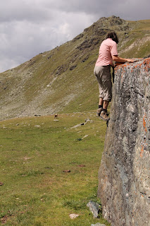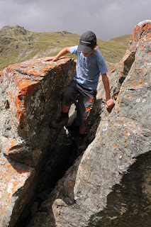 Allmählich verdüstert sich der Himmel. Als auch noch ein Donner grollt, ist das das Zeichen zum Aufbruch. Wir machen uns wieder an den Abstieg. Fabian klagt über Schmerzen beim Rucksacktragen und überlegt sich eine neue Tragart, die sich allerdings nicht durchsetzen wird.