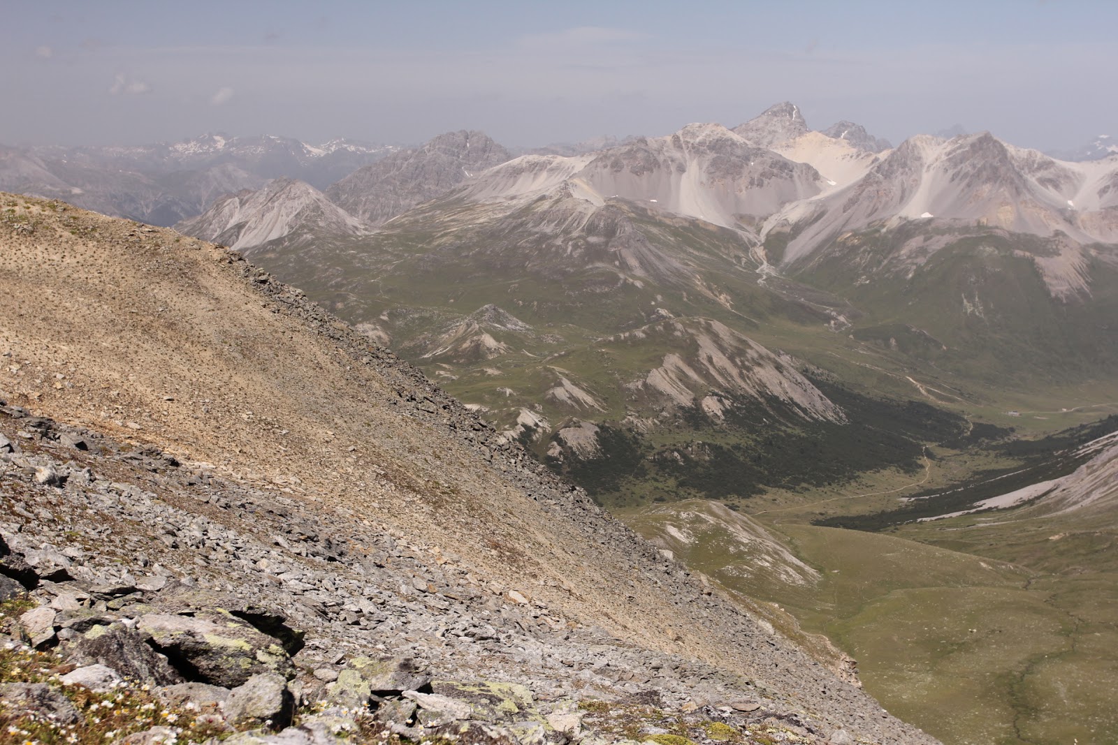 Bezüglich Blumennamen lasse ich mich gerne belehren. Bald erreichten wir den Gipfel. Wir genossen eine wunderbare Aussicht bis ins Südtirol, auf den Ortler, den Nationalpark und alle anderen Bündner Berge.