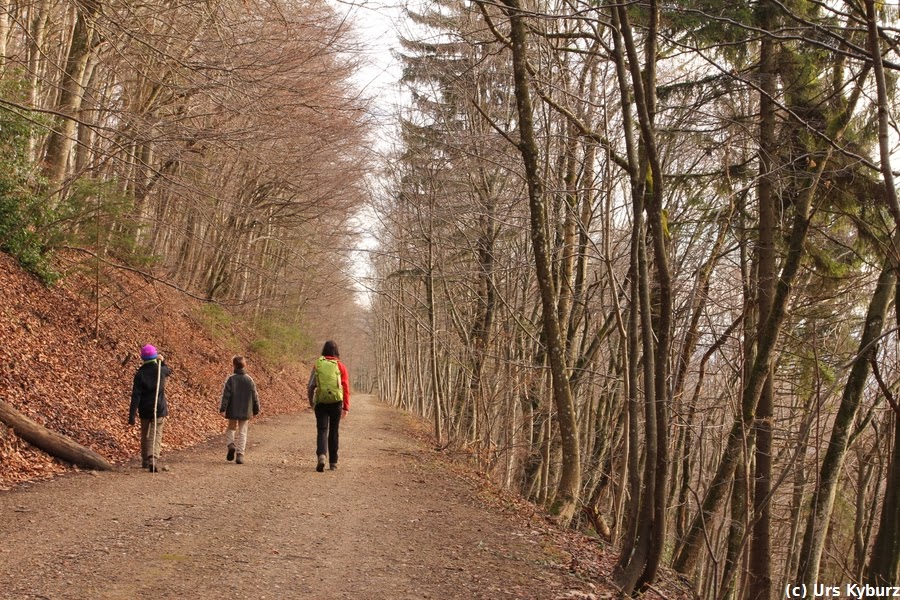 Unsere Wanderung startete auf der Staffelegg bei bedecktem Himmel, aber wir hofften immer noch auf Sonne. Die erste Hälfte der Wanderung dominierte Buchenwald. So ohne Blätter war das trotzdem eine ziemlich lichte Angelegenheit. Und vor allem: Es war absolut RUHIG! Wunderschön! Bis Linn begegneten wir keiner einzigen Person, wir waren mutterseelenallein unterwegs.