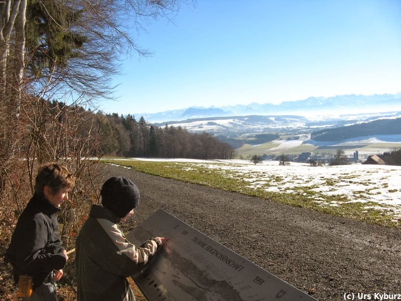 Die Kinder mussten auch heute bewegt werden, ich wählte deshalb den Stierenberg, den höchsten Gipfel im Kanton Aargau, aus. Höchster Gipfel ist relativ, bescheidene 872 Meter misst er. Aber man geniesst eine wunderbare Aussicht vom Säntis bis zum Chasseral, allerdings nicht vom Gipfel, denn dieser ist vollkommen von Wald bedeckt.