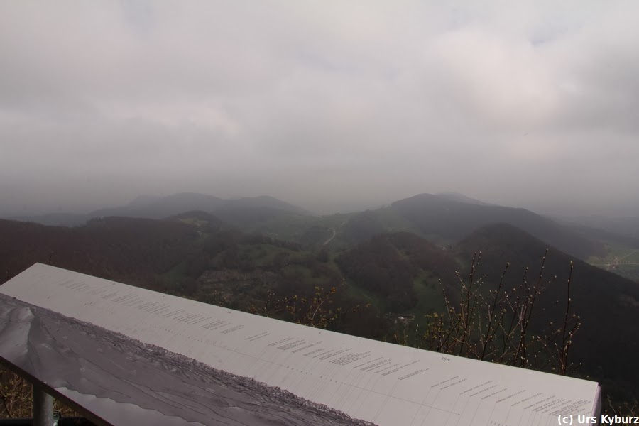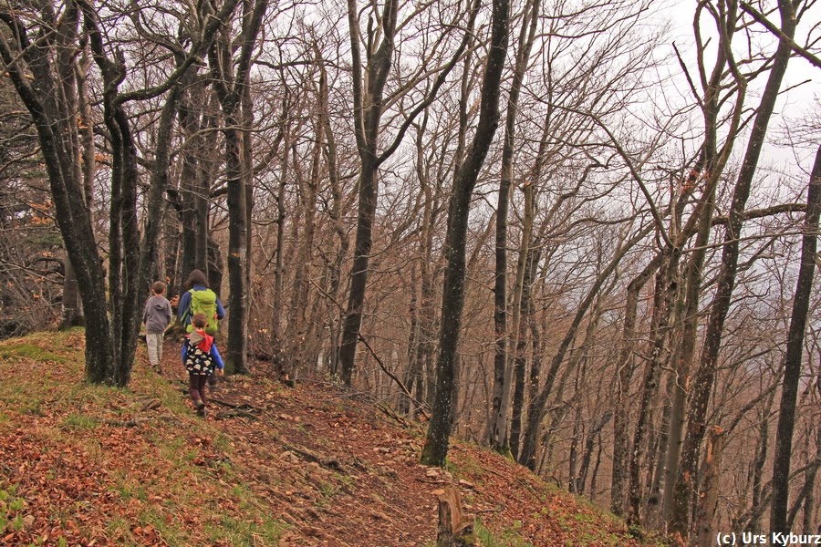 Bei nebligem Wetter entsteigen wir auf der Passhöhe der Staffelegg dem Bus, der uns von Aarau hierher gebracht hat. Da uns noch ein Geocache erwartet, folgen wir nicht dem Wanderwegweiser, sondern nehmen die Strasse weiter unten Richtung Aarau. Bald treffen diese beiden Wege aber wieder aufeinander. Auch den Asphalt haben wir bald hinter uns. Auf einer Weide grasen Kühe mit Hörnern, was heute eine grosse Ausnahme ist. Die Erklärung erhalten wir beim Herzberghof, der biologisch-dynamisch nach den Vorschriften von Demeter bewirtschaftet wird. Nach diesen dürfen Kühe nicht enthornt werden. Wir wandern weiter durch einen Wald. Wie Säulen stehen die Buchen, zusammen mit dem Nebel umgibt uns eine magische Stimmung. Schon haben wir das Bänkerjoch erreicht. Eine grosszügige Grillstelle würde zu einer Rast einladen, aber erstens ist es noch zu früh für das Mittagessen und zweitens sind die Temperaturen nicht gerade so, dass man länger sitzen möchte. Dafür haken wir noch den zweiten Geocache ab, der hier in der Umgebung versteckt ist.