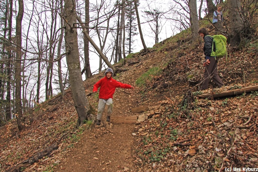 Während wir uns stärken, bewundern wir die Aussicht. Wir sähen den halben Alpenbogen von den Berner bis zu den Appenzeller Alpen, das Mittelland Richtung Innerschweiz und Zürich, das Fricktal, den Schwarzwald und die Vogesen. In der Realität lässt uns der Nebel nur bis Aarau schauen, trotzdem geniessen wir die Vogelperspektive, die wir von hier oben haben. Fabian erhält von der Mutter Erklärungen zur Kartenkunde. Wo sind wir? Wo gehen wir durch? Wo ist das Ziel? Mit diesem Wissen brechen wir auf und wandern auf dem Grat wieder zurück, folgen diesem aber weiter statt wieder nach rechts abzubiegen. Der Weg wird breiter, die Blumen spriessen überall aus dem Waldboden, damit sie noch genügend Licht haben, bevor die Bäume dieses mit ihrem Laub wieder abschirmen. Alle Arten von Vögel zwitschern, da und dort huscht ein Mäuschen vorbei. Allmählich nähern wir uns dem Ziel, doch vorher holen wir noch den letzten Cache dieser Tour. Dann hetzen