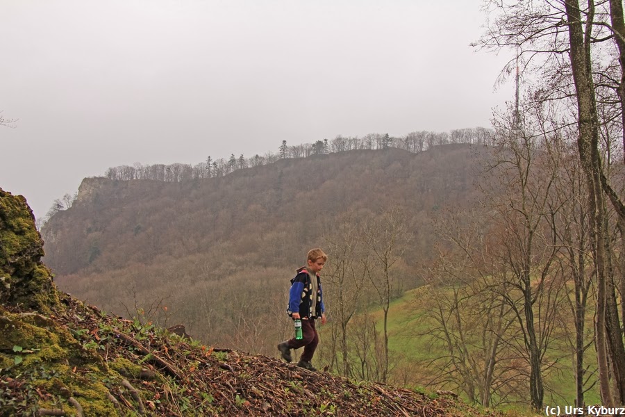 Der Weg wird nun steil, dafür öffnet sich der Blick ins Fricktal. Auf der Höhe angekommen, erblicken wir erstmals unser Ziel: Die Wasserflue, der zweithöchste Punkt im Kanton Aargau, mit der markanten, 112 Meter hohe Antenne für Radio, Fernsehen und Mobiltelefonie. Die vermeintliche Abkürzung führt uns mitten durch den Wald, bis wir wieder einen angedeuteten Pfad erkennen können. Unsere Jungs wieseln den steilen, rutschigen Pfad hoch, wir hinterher, bis wir den Grat erreichen und gleichzeitig den höchsten Punkt auf 866 Meter. Zum Aussichtspunkt geht es abwärts Richtung Osten, vorher heben wir aber noch Cache Nummer drei. Auf kleinere Kinder sollte man hier ein Auge drauf haben, da es links zum Teil deutlich abwärts geht, sprich Absturzgefahr herrscht bei unvorsichtigem Gehen.