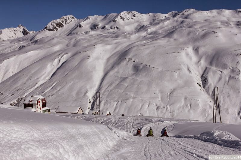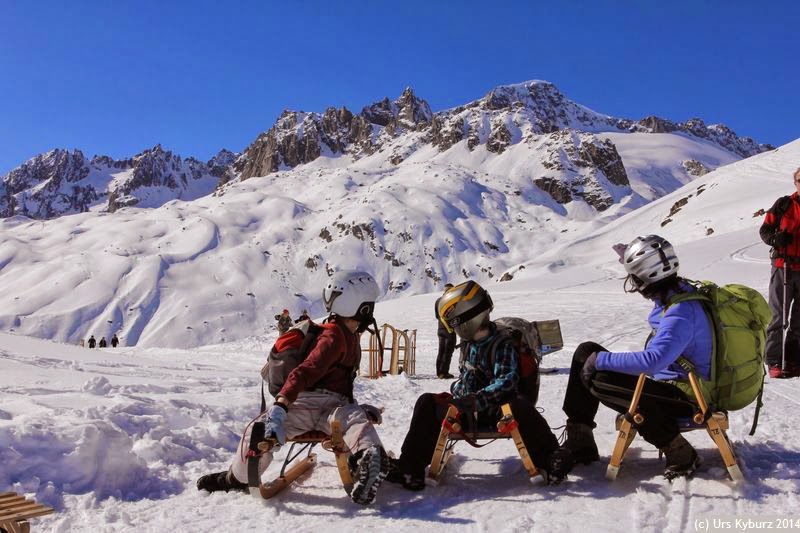 Allerdings fahren wir zuerst vorsichtig und üben das Bremsen. Doch schon bald werden wir mutiger und haben unsere Untersätze im Griff. Wir haben voll den Spass, da vergisst man gleich, dass man auch auf Skitour hätte gehen können.