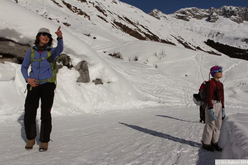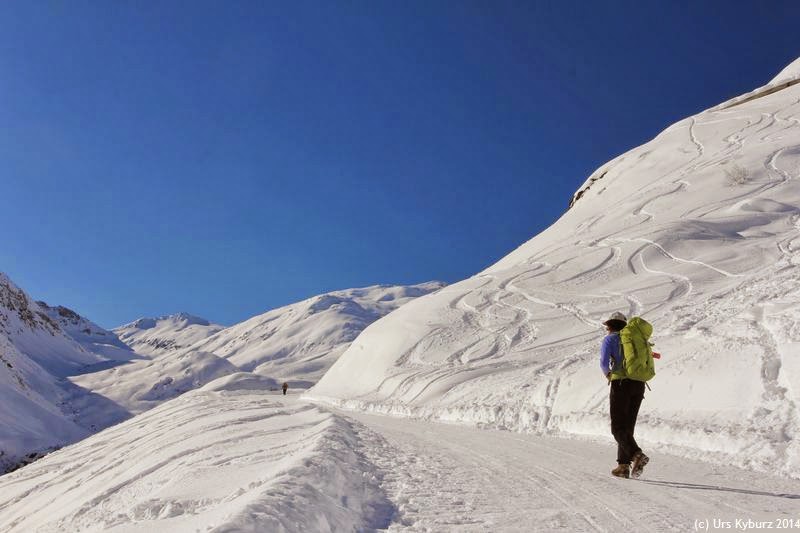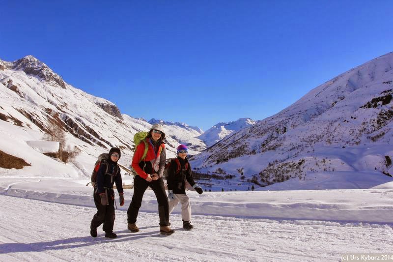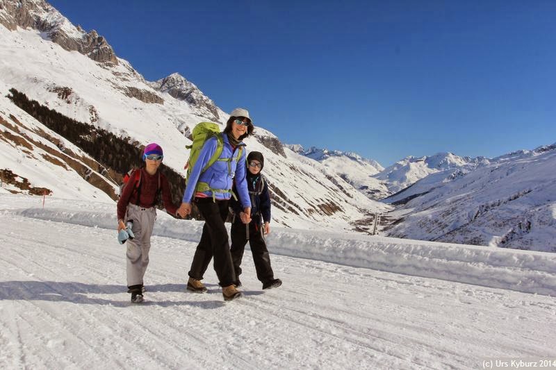 Es ist noch ziemlich kalt im Schatten, aber schon bald wird sich das ändern, nämlich wenn wir an die Sonne kommen. Dort, wo im Sommer Autos und Töffs rauf und runter rasen und ihre Abgase in der frischen Alpenluft verteilen, ist nun ein wunderbarer Winterwanderweg, der jeweils von Hansruedi Tresch vom Hotel Tiefenbach perfekt präpariert wird.