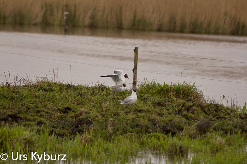 Nun wird's aber Zeit, nach draussen zu gehen. Auf einem Steg bewegen wir uns zwischen dem Schilf, erreichen dann eine Strauchzone, wo eine Nachtigall lauthals ihr Lied schmettert. Eine Maus huscht im Laub umher, im Teich jedoch ist nicht viel los. So steuern wir den ersten Hide an. Wir haben freien Blick auf einen kleinen See und die Brutinseln der Lachmöwen. Diese veranstalten einen Heidenlärm.