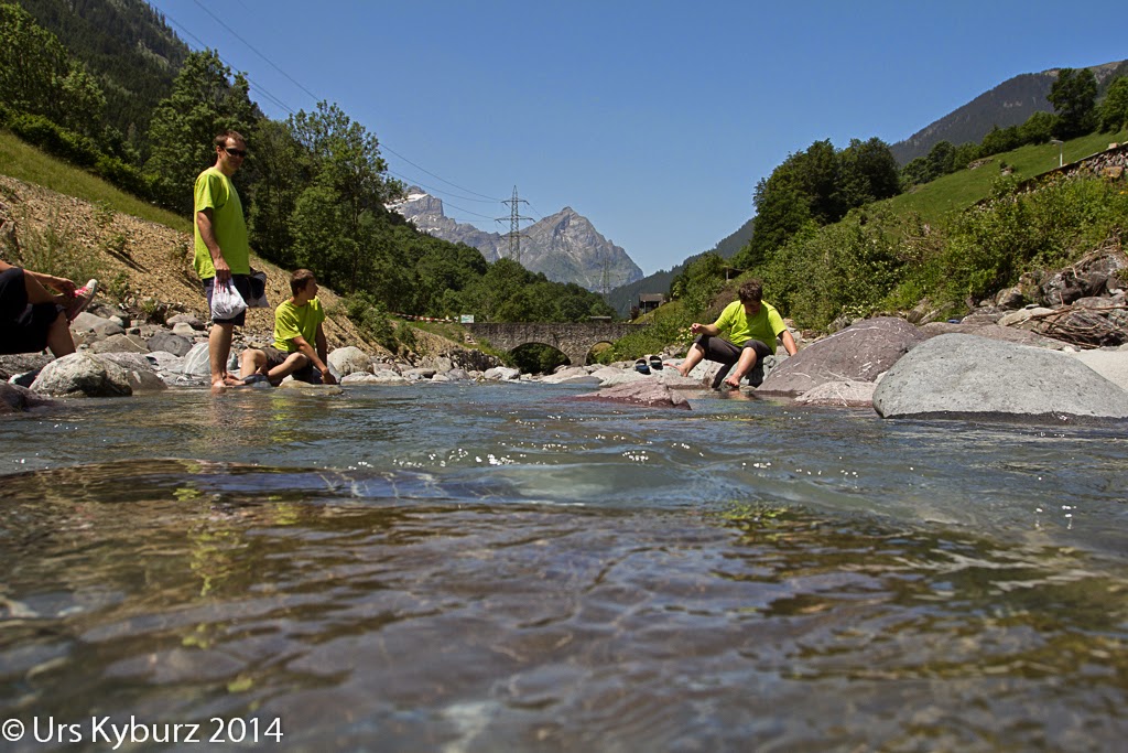 Am letzten Tag fahren wir gleich am Morgen ins Tal ab und dann wieder hoch ins Sernftal nach Engi. Dort liegt ein riesiger Felsen, der von einer Lawine quasi freigelegt wurde. Allerdings ist es schon am Morgen früh heiss. Trotzdem wird noch munter geklettert bis am Mittag, danach kühlen wir uns am Fluss etwas ab bevor wir endgültig heim zu fahren.