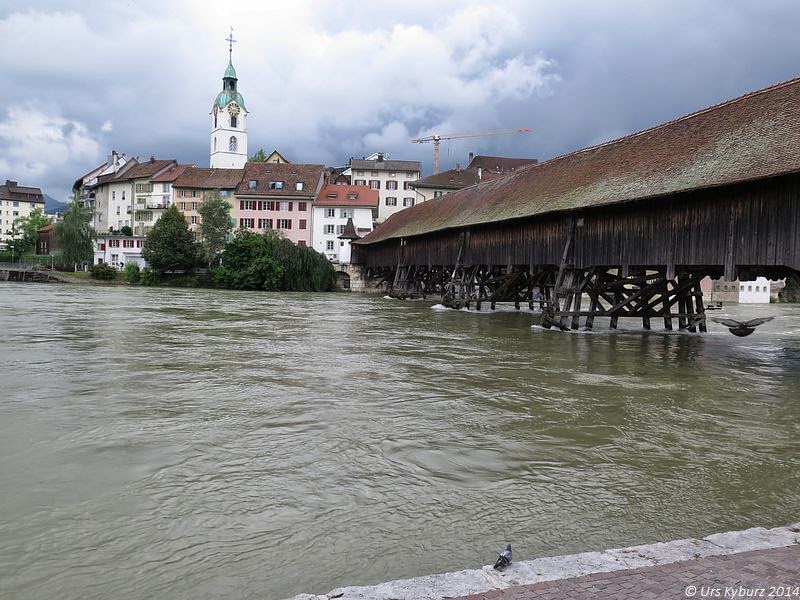 Beim Weitergehen standen wir plötzlich vor einem Kühlturm: Das AKW Gösgen. Es war schon etwas unheimlich, vor diesem Ding zu stehen. Gleich daneben war ein Gebäudekomplex mit noch mehr Stacheldraht eingezäunt, eine Munitionsfabrik. Nun ja, es kann sich jeder seine Gedanken machen. Bei Dulliken wurden wir nochmals vom Wanderweg abgedrängt wegen einer Baustelle und mussten auf Asphalt das Dorf durchqueren. Doch schon bald waren wir wieder an der Aare, im Grünen. Und uns gefiel es. Olten kam näher. Respektive wir näherten uns Olten. Beim Stauwehr, das den Pegel der Aare reguliert, schwamm eine Gänsesägermama mit einer ganzen Schar Jungen. Plötzlich war eine Barriere quer über den Spazierweg mit einem Fussgängerverbot. Wegen Überschwemmung. Was sollten wir machen? Auf der angrenzenden Hauptstrasse gehen? Nein, wir taten einfach so, als ob wir das alles nicht gesehen hätten. Und als uns dann noch Leute entgegenkamen, waren wir sicher, dass wir nicht schwimmen mussten.
