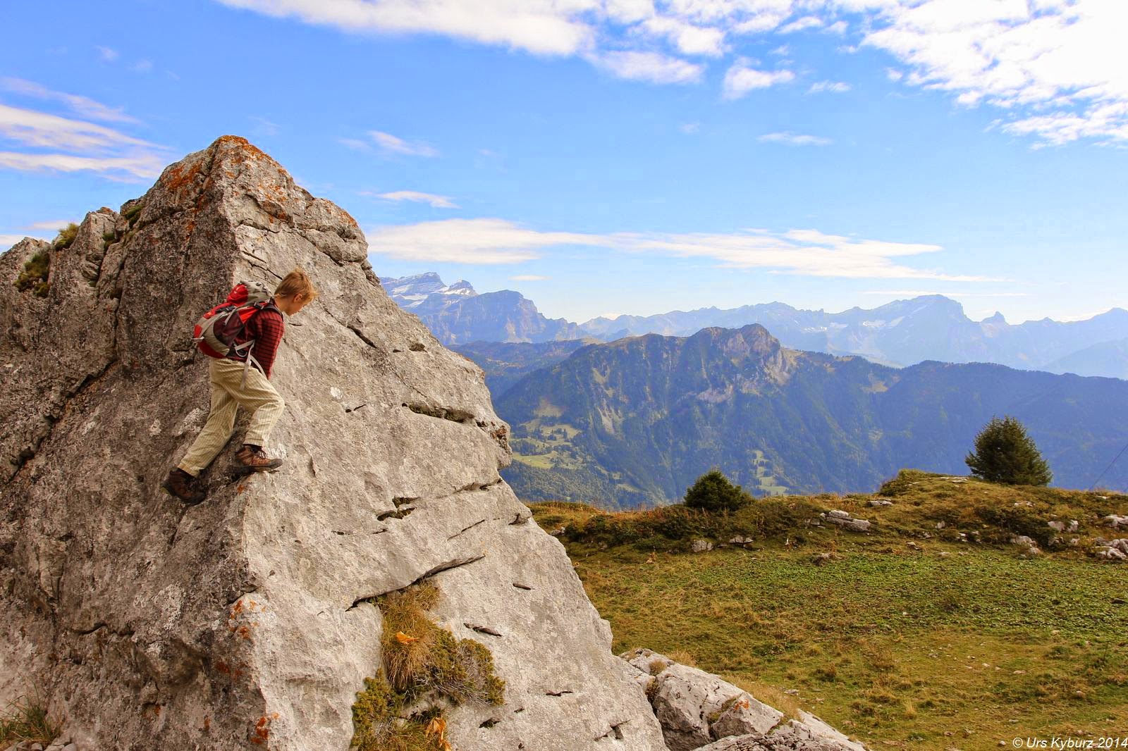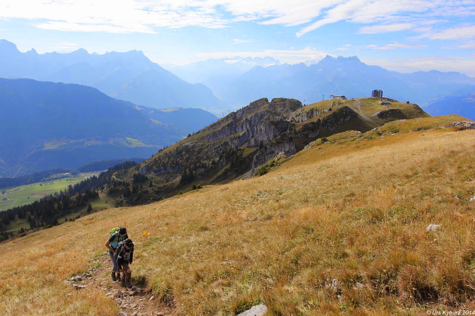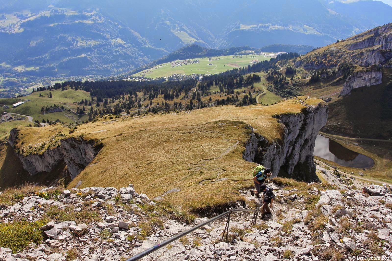 Tags zuvor, einem Sonntag, konnten wir vom Lac de Mayen aus die Aufstiegsroute auf die Tour d’Aï studieren. Die Wanderer standen sich auf den Füssen rum, bei den Schlüsselstellen gab es Warteschlangen. Am Montag in der Talstation: Kein Mensch. In der Bergstation: Kein Mensch. Beim Verlassen derselbigen blendete uns das futuristische Drehrestaurant „Le Kuklos“ auf La Berneuse. Wir stiegen zum Lac d’Aï ab, allerdings nur langsam, weil die Jungs die Downhillstrecke für die Mountainbiker intensiv studierten und kommentierten. Wir waren notabene immer noch alleine unterwegs, nur ein paar Monteure bereiteten einen Sessellift auf die Wintersaison vor. Wir guckten fasziniert die gewaltigen senkrechten Wände der Tour d’Aï an. Überall glänzten Bohrhaken, allerdings waren die Schwierigkeiten jenseits unserer derzeitigen Form. Weiter rechts waren die Routen nicht mehr so hoch und nicht mehr so schwer. Wir setzten also wieder einen Punkt auf unsere Todo-Liste für diese Ferien. Am Ende dieses Felsbandes zeigte uns eine weiss-blaue Markierung den Einstieg in den Weg zur Tour d’Aï. Klettersteigähnlich mit Metalltritten und Drahtseilen ging es die ersten Dutzend Meter hoch. Wer hier schon Bammel hat, sollte besser wieder umkehren, denn gemütlicher wird es gegen oben nicht.