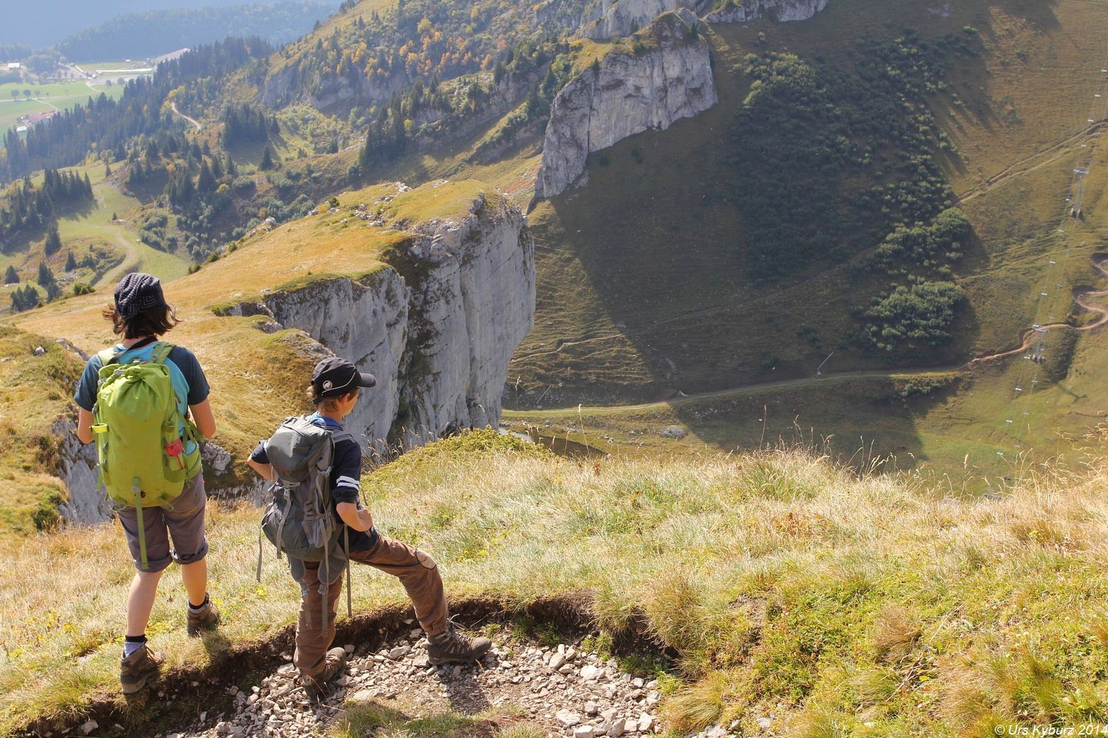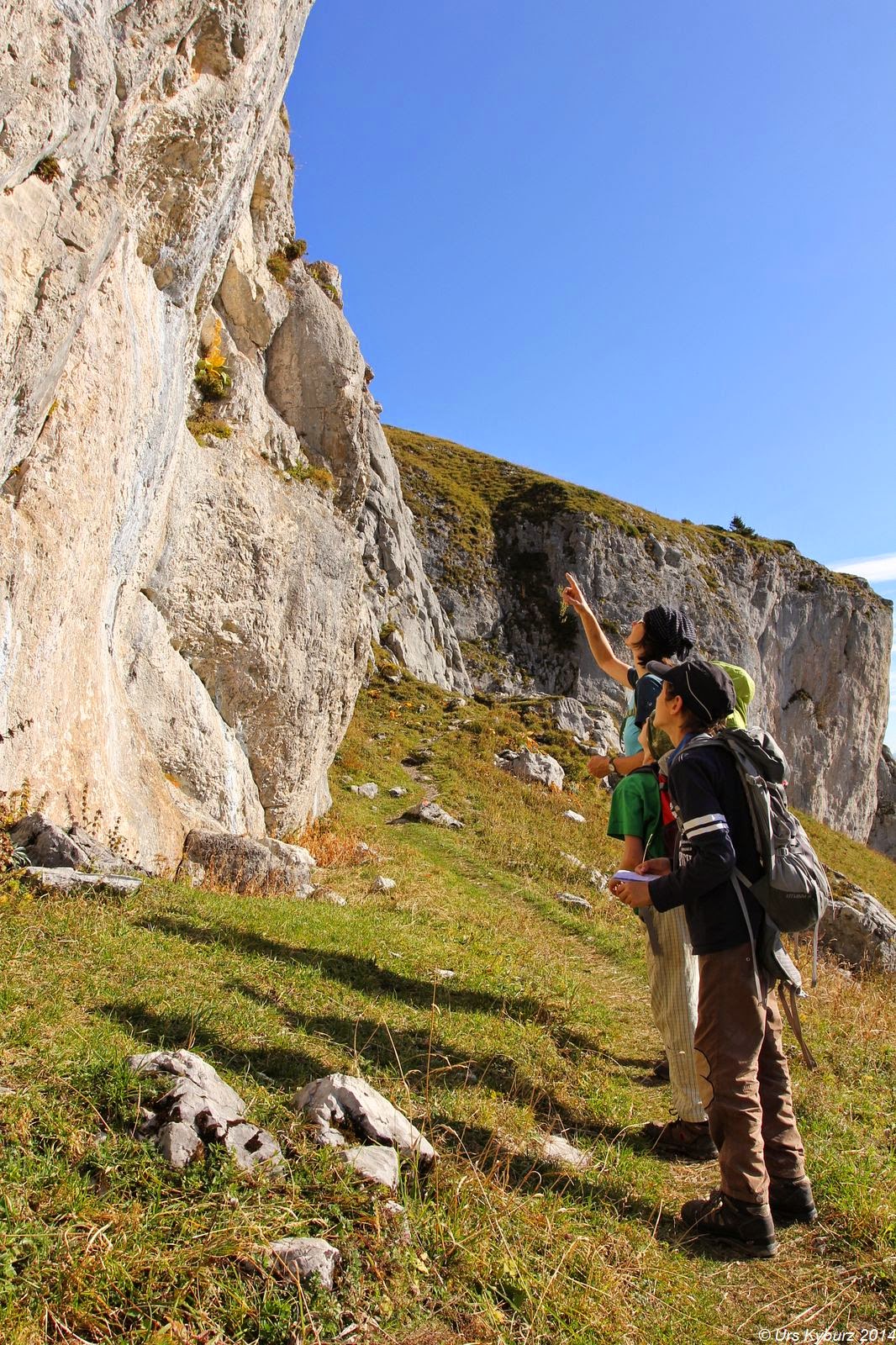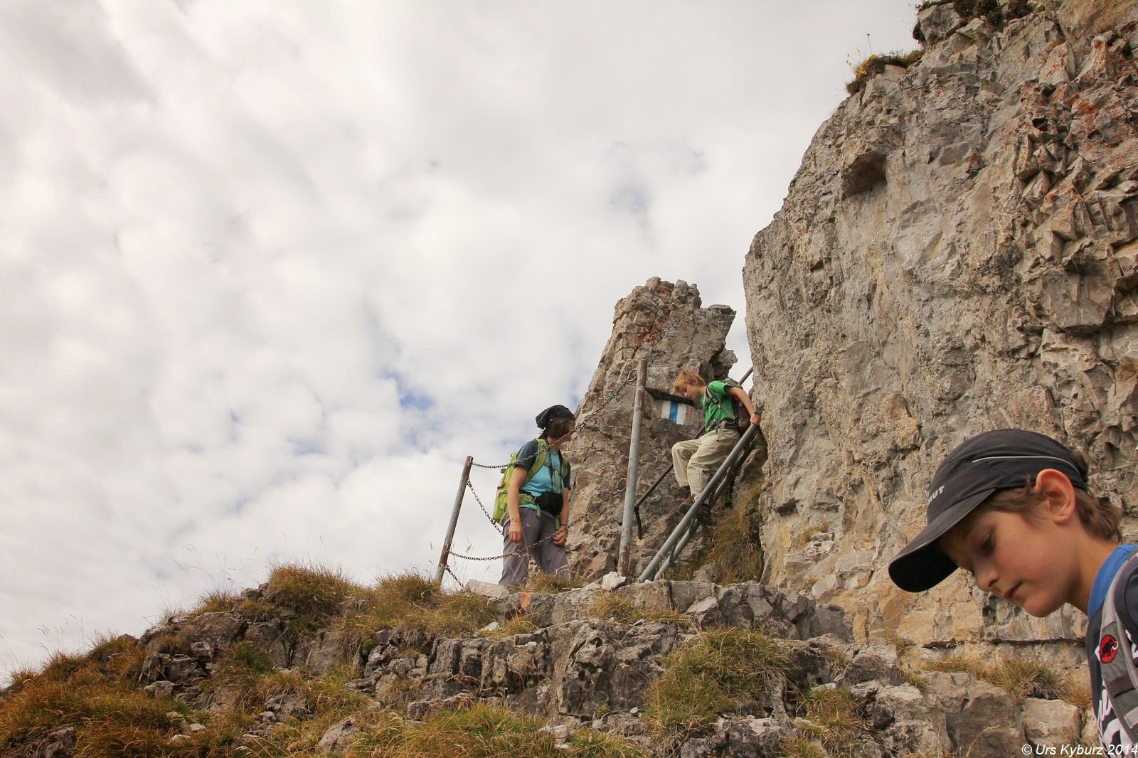 Tags zuvor, einem Sonntag, konnten wir vom Lac de Mayen aus die Aufstiegsroute auf die Tour d’Aï studieren. Die Wanderer standen sich auf den Füssen rum, bei den Schlüsselstellen gab es Warteschlangen. Am Montag in der Talstation: Kein Mensch. In der Bergstation: Kein Mensch. Beim Verlassen derselbigen blendete uns das futuristische Drehrestaurant „Le Kuklos“ auf La Berneuse. Wir stiegen zum Lac d’Aï ab, allerdings nur langsam, weil die Jungs die Downhillstrecke für die Mountainbiker intensiv studierten und kommentierten. Wir waren notabene immer noch alleine unterwegs, nur ein paar Monteure bereiteten einen Sessellift auf die Wintersaison vor. Wir guckten fasziniert die gewaltigen senkrechten Wände der Tour d’Aï an. Überall glänzten Bohrhaken, allerdings waren die Schwierigkeiten jenseits unserer derzeitigen Form. Weiter rechts waren die Routen nicht mehr so hoch und nicht mehr so schwer. Wir setzten also wieder einen Punkt auf unsere Todo-Liste für diese Ferien. Am Ende dieses Felsbandes zeigte uns eine weiss-blaue Markierung den Einstieg in den Weg zur Tour d’Aï. Klettersteigähnlich mit Metalltritten und Drahtseilen ging es die ersten Dutzend Meter hoch. Wer hier schon Bammel hat, sollte besser wieder umkehren, denn gemütlicher wird es gegen oben nicht.
