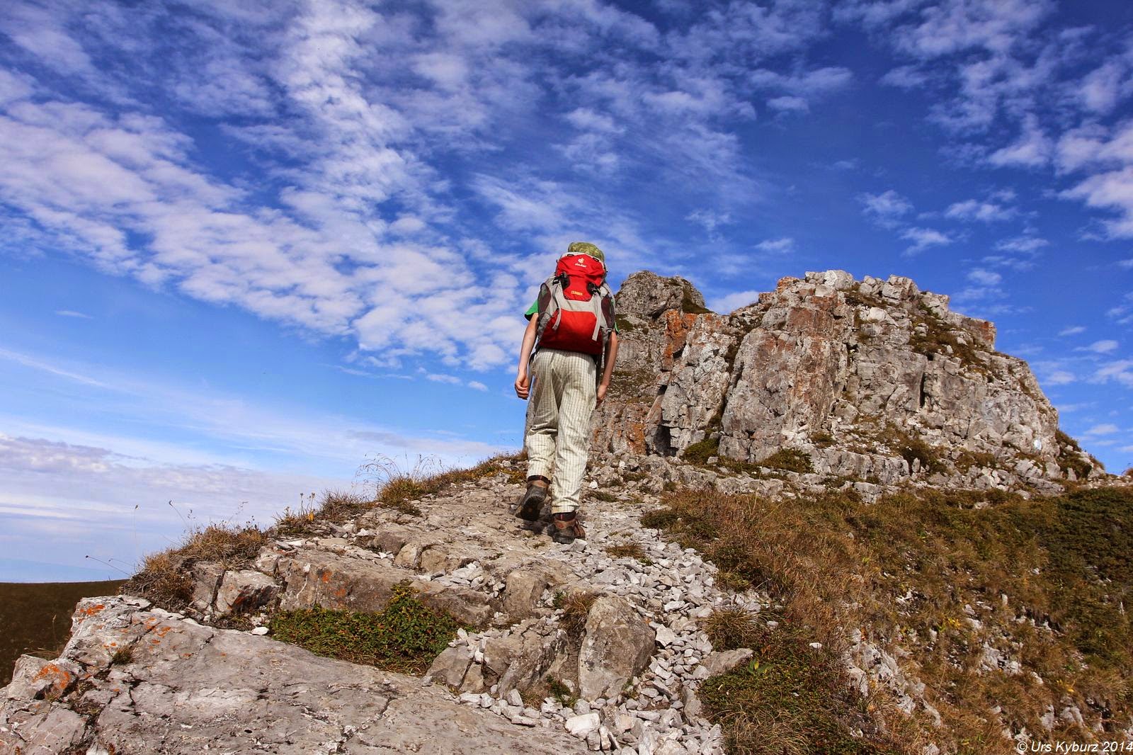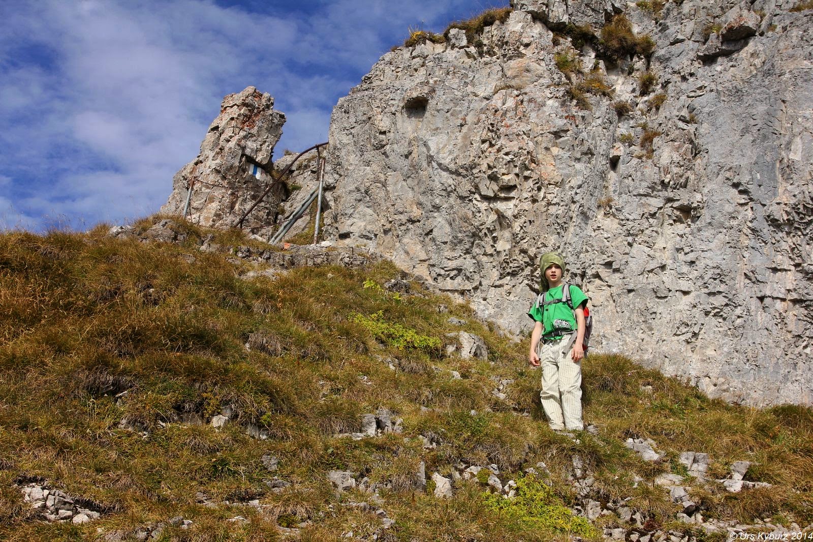 Auch auf uns wartete nun eine Herausforderung. Diese begann mit einer kurzen Leiter, danach folgten links und rechts Felsen, allerdings auf der einen Seite in die Höhe, auf der anderen in die Tiefe. Der Jüngere ging vor mir, trittsicher wie immer. Mir war etwas mulmig zu Mute. Zwischendurch waren die Felsen nur noch untenrum, das heisst, sie fielen links und rechts fast senkrecht ab, der Weg war keinen Meter breit, das Geländer war über der Kopfhöhe des Jungen. Meine Nerven! Er hatte wohl die besseren, ungerührt ging er weiter und freute sich, dass er mal auf einen Steinadler blicken konnte, der unten an der Felswand vorbei zog. Schon komisch. Hundert Meter in einer senkrechten Wand zu klettern macht(e) mir nichts aus, bin ich ungesichert auf einem Weg und es geht auf der einen Seite deutlich abwärts, habe ich erhöhten Puls.