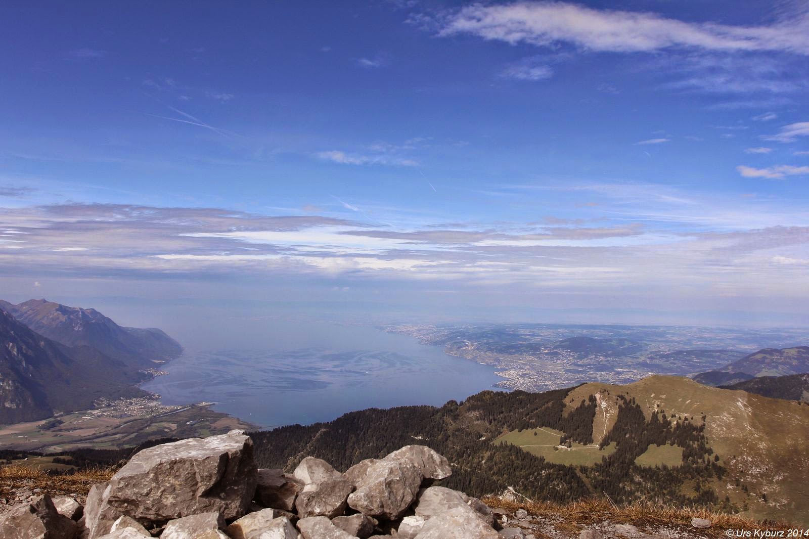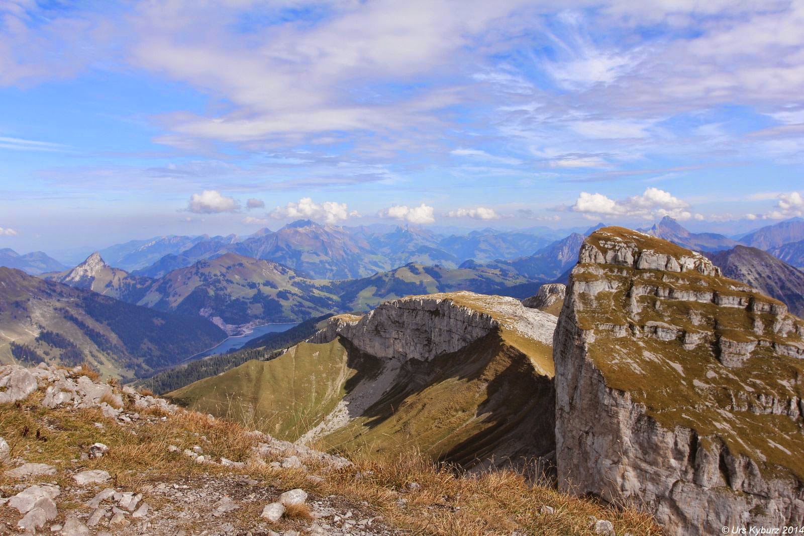 Endlich erreichten wir den Gipfel, ich konnte vorerst entspannen. Dieser war entgegen dem Aufstieg breit. Was für eine Aussicht! Und die beste Armee der Welt feierte uns mit Salutschüssen auf dem Waffenplatz, auf den wir blicken konnten. Aber dieses Panorama! Gigantisch! Uns zu Füssen glitzerte der Genfersee, im Dunst konnte man gerade noch knapp die Jurakette ausmachen, das zugebaute Mittelland frass sich wie ein Krebsgeschwür ins Grüne. Die felsige Gastlosenkette erhob sich senkrecht aus den grünen Alpweiden, weiter hinten waren Eiger, Mönch und Jungfrau auszumachen, ebenso das Aletschhorn, Obergabelhorn, die Dent Blanche, das Matterhorn, der Grand Combin, womit wir schon bei den Walliser Riesen wären. Fast alle diese Berge beschworen wieder Erinnerungen herauf, ich stand schon auf deren Gipfel oder war ihnen zumindest mal nahe.