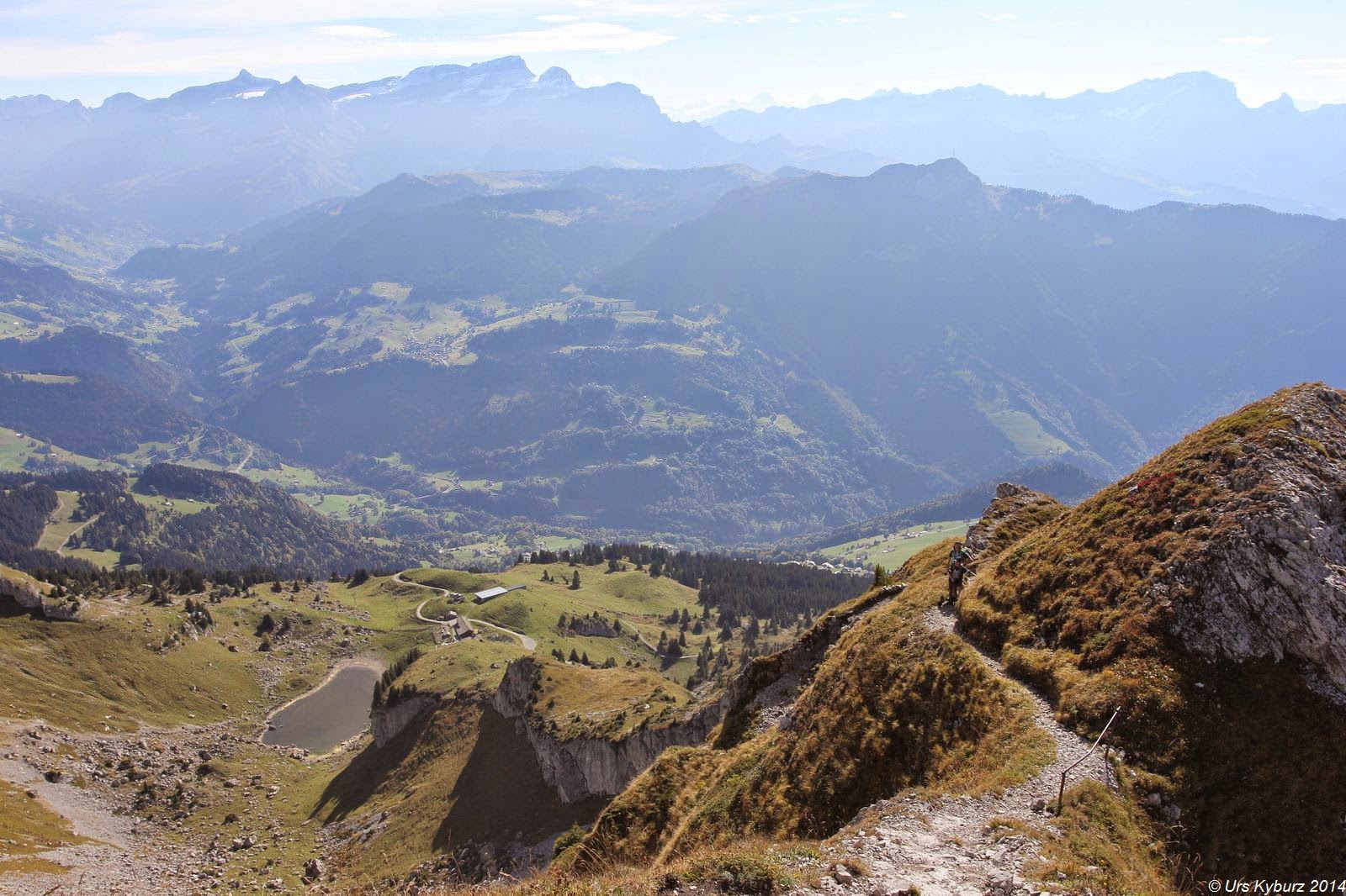 Die Alpendohlen, die uns umkreisten, interessierten sich nicht für die Berge, dafür umso mehr für das, was wir dabei hatten. Ein Australier erreichte nun auch noch den Gipfel. In Turnschuhen. Kurz darauf stiess auch noch eine junge Frau zum Kreis der Gipfelstürmer, vom Klettersteig her kamen eine Frau und ein Mann. Wir waren also nun zu acht, keine Vergleich zum Sonntag. Noch ganz überwältigt von der Aussicht, nahmen wir den Abstieg in Angriff. Vorsichtig gingen wir denselben Weg zurück. Ein Geocache in der Nähe der Leiter wollte sich uns nicht offenbaren. Nachdem wir die grössten Schwierigkeiten (eigentlich ist der Weg ja nicht schwierig, aber sehr ausgesetzt) hinter uns hatten, legten wir nochmals eine Pause ein. Der weitere Abstieg verlief problemlos. Wir hatten noch den Gegenanstieg zur Bergstation zu bewältigen, dann war die Tour gelaufen. In der Wand sahen wir zwei Personen im Klettersteig. Dieser interessierte uns nicht, wenn schon, dann die Sportkletterrouten. Wenn man nur mehr Zeit zum Trainieren hätte…