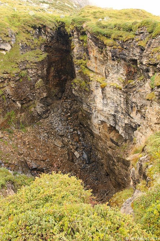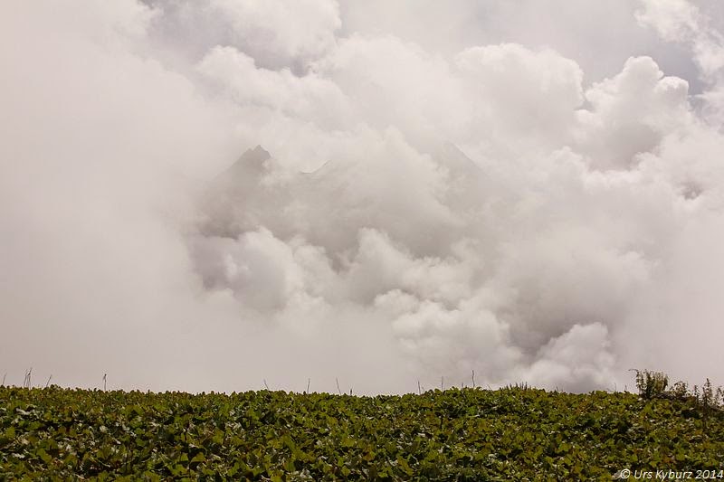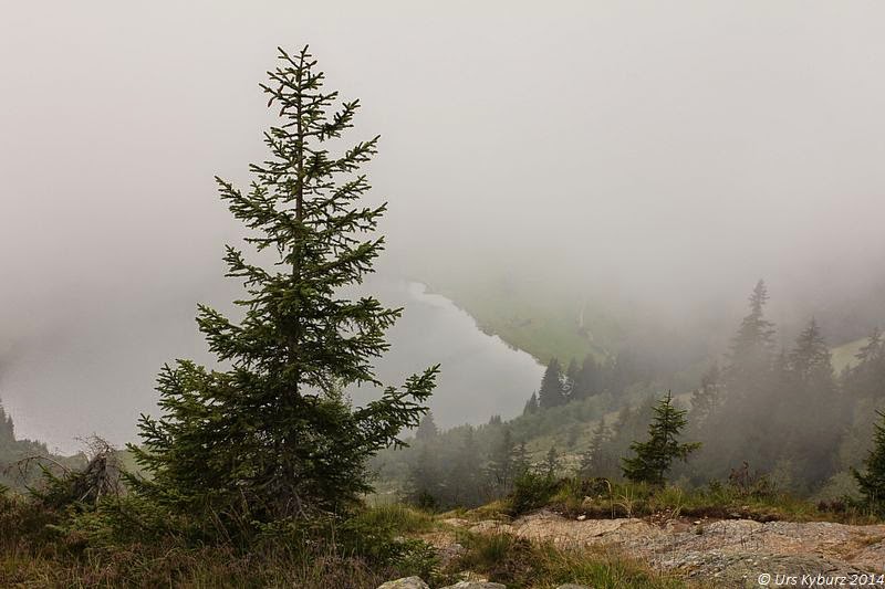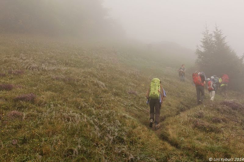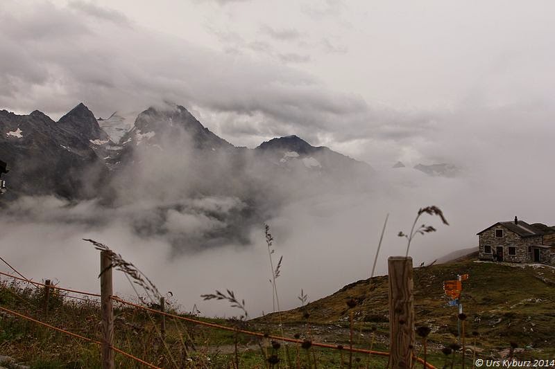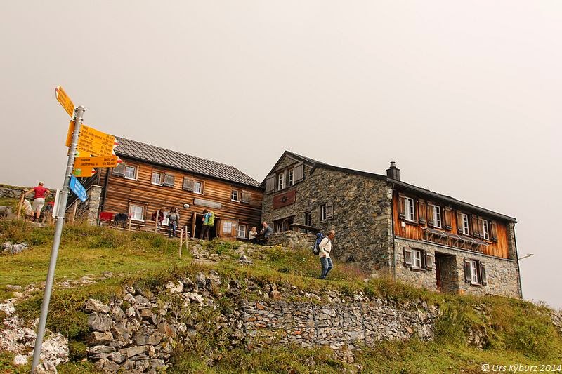 Die Anfahrt von Amsteg nach Bristen ist nichts für schwache Autofahrernerven. Die schmale Strasse windet sich auf engstem Raum steil empor. Innert kürzester Zeit überwanden wir einen enormen Höhenunterschied. Mit der Seilbahn von Bristen nach Golzern gewannen wir nochmals auf die bequeme Art viele Höhenmeter. Danach war es allerdings fertig mit faulenzen. Gleich nach der Bergstation wählten wir den Weg über Oberchäseren. Ein steiler Pfad wand sich im Zickzack hoch. Von der Landschaft bekamen wir nicht viel mit, zu dicht war der Nebel. Wie in Watte gehüllt stiegen wir über die Weiden empor. Nach gut der Hälfte gingen die Weiden über in krautige Bergwiesen, wo der giftige Eisenhut blühte. Dass auch das Maderanertal vom schlechten Wetter nicht verschont blieb in diesem Sommer, sah man dem Weg an, er war dreckig und rutschig. Bei Oberchäseren legten wir einen Halt ein, und es machte den Anschein, als würde bald die Sonne durch den Nebel brechen.