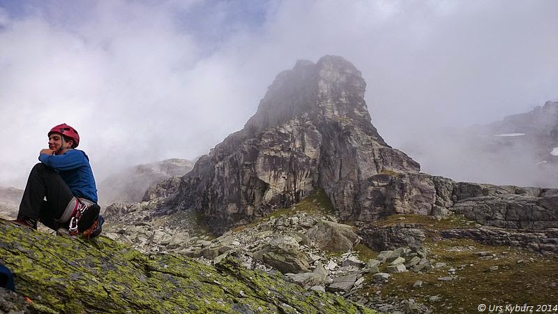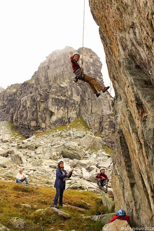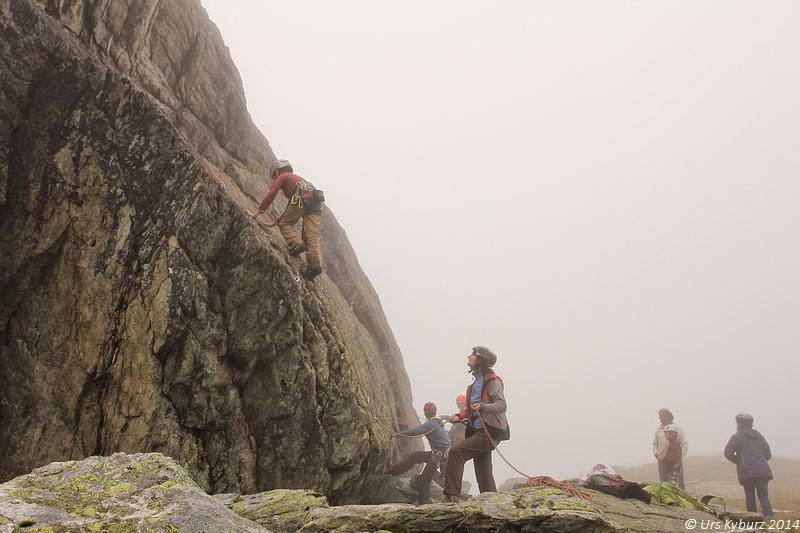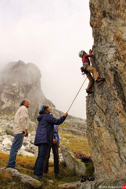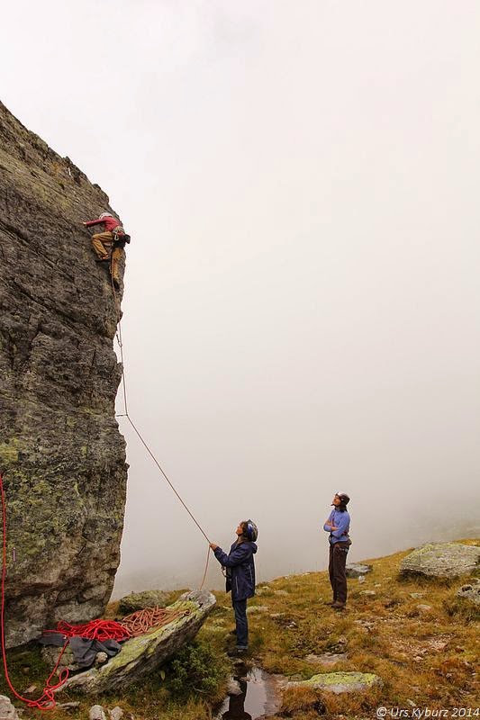 Die Nacht war sternenklar, zum ersten Mal waren die Umrisse der umliegenden Gipfel zu sehen. Das liess für den nächsten Tag hoffen. Doch welche Enttäuschung beim Aufstehen: Oben dicke Wolken, unten Nebel, dazwischen wir. Es eilte also nicht. Nach dem Frühstück die Umfrage: Wer hat Lust auf was? Die Mehrheit war wider Erwarten fürs Klettern, also machten wir uns auf zum „Hausblock“, einem frei stehenden Felsen. Dort war die Wahrscheinlichkeit am grössten, dass der Fels trocken ist. Tatsächlich, er war kletterbar, so dass wir uns flugs bereit machten und in die ersten Routen einstiegen. Keine war länger als 15 Meter, aber es machte Spass. Die Älteren nahmen es gemütlich und schauten den Jungen zu, wie sie gewandt die Schwierigkeiten überwanden. Von einfach bis überhängend hatte es für alle etwas. Die Jüngsten hatten irgendwann genug, sie vergnügten sich an einem der zahlreichen Bächlein. Mit Eifer stauten sie dieses, bis es einen anderen Lauf nahm. Nach der Mittagspause packten wir zusammen und kehrten zur Hütte zurück. Immer wieder drückte die Sonne durch den Nebel, aber ganz löste er sich nie auf.Am "Hausblock" |