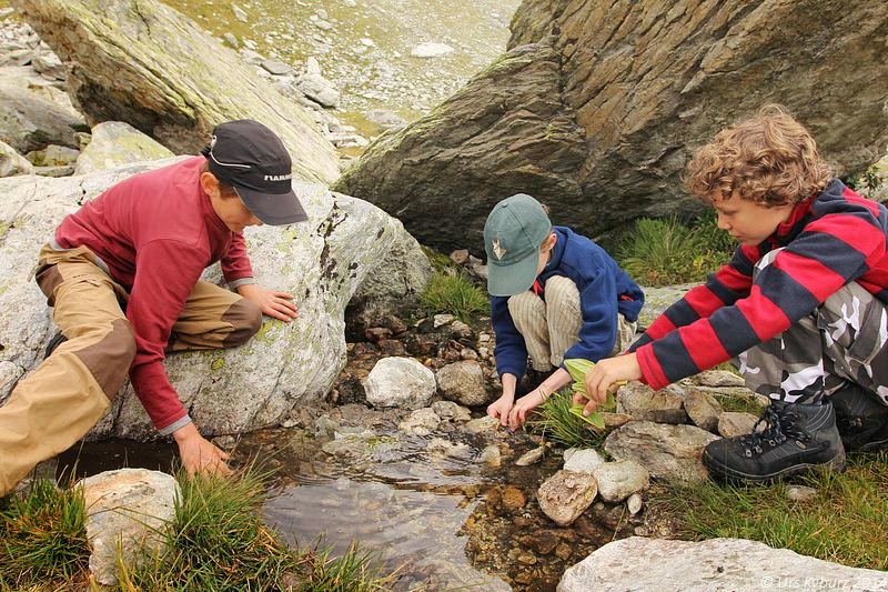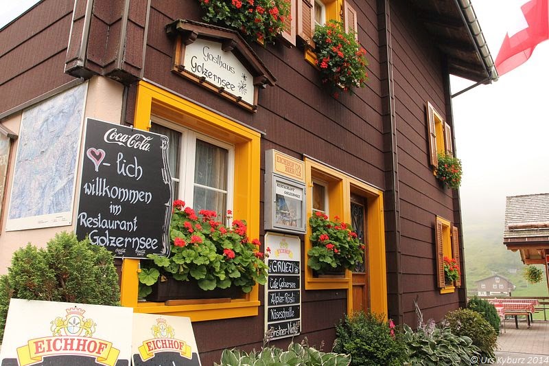 Für den Abstieg wählten wir den weniger steilen Weg am Golzernsee vorbei. Heidelbeersträuchern am Wegrand blieben nicht unangetastet, zu verlockend waren die blauen Beeren. Es wurde immer dunkler und kühler, es kündigte sich eine Kaltfront an. Bald erreichten wir den Wald und erblickten erstmals den Golzernsee. Beim Weiler Golzern hätte es sehr einladende Bergbeizen gehabt, aber unsere Jungen eilten uns davon. Zudem setzte nun auch noch Regen ein. So schleppten wir wenigstens die Regenjacken nicht vergebens mit. Der Weg von Golzern zur Seilbahnstation war mehr oder weniger eben. An jeder Hausecke hätte man Kristalle kaufen können, aber die Kinder hatten selber schon viele Schätze gesammelt. Die Seilbahn führte uns wieder an den Ausgangspunkt zurück, wo die Tour erfolgreich und ohne Zwischenfälle endete.