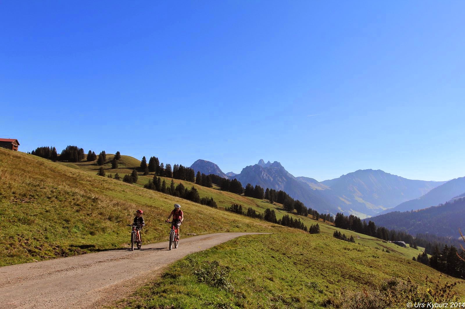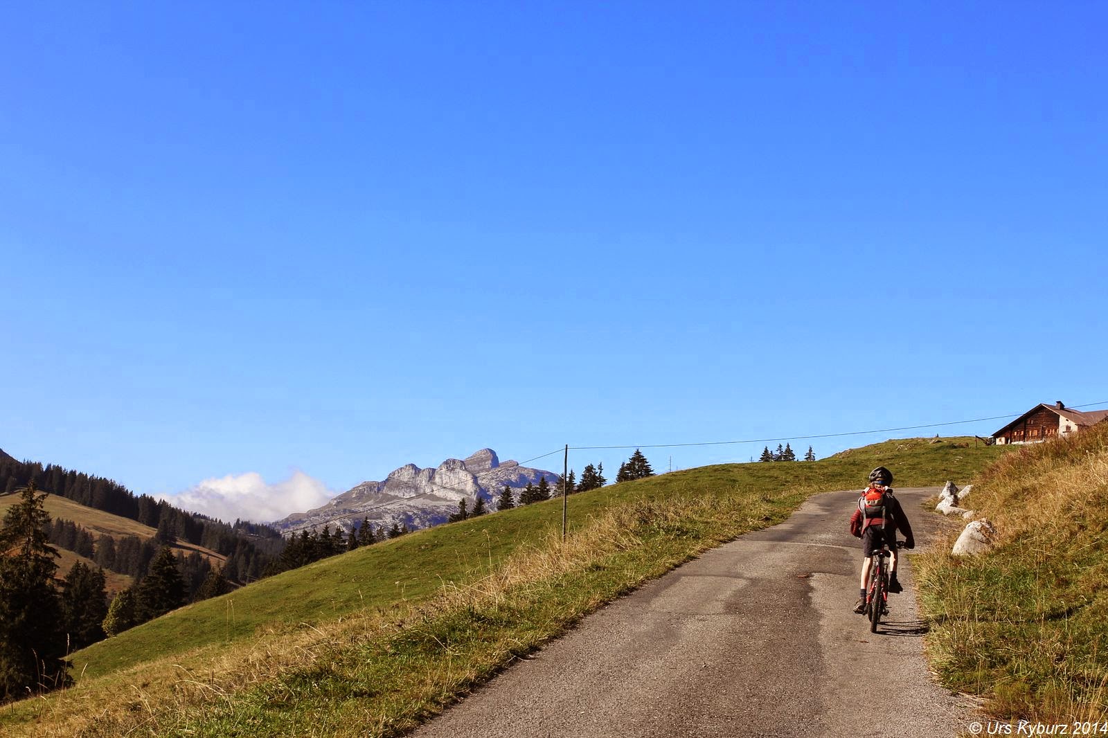 La Lécherette durchquerten wir und bogen nach dem Dorf links ab. Wir fuhren zwar auf Asphaltstrasse, aber die Steigung war so gross, dass wir doch ordentlich ins Schwitzen gerieten. Bald konnten wir auf den Col des Mosses hinunterblicken. Die grossen Eisberge waren nur noch vereinzelt auszumachen, es dominierten die Voralpenberge des Pay d’Enhaut, des Simmentals und jene um den Rochers de Naye. Bei Les Mossettes bogen wir rechts ab, denn wir wollten noch einen Gipfel besteigen, aber erst nach einer Pause. Auf der Karte waren zwei Alpgebäude als Käsereien eingezeichnet, aber jetzt, anfangs Oktober, waren natürlich alle Kühe wieder im Tal, somit gab es auch keinen Käse mehr zum Probieren und Kaufen. Ab jetzt wurde es richtig steil, zum Glück nicht anhaltend. Der Jüngste kämpfte mit seinen bescheidenen sechs Gängen, aber schieben? Sicher nicht! Mit einem unglaublichen Willen erklomm er die Steigungen fahrend. Bei der Alp La Montagnette konnten wir erstmals einen Blick auf Château-d’Oex und das Pays d’Enhaut werfen. Grandios, diese Aussicht! Noch waren wir aber nicht auf dem Mont Chevreuils. 300 Meter über einen Kuhtrampelpfad, der einem fast die Plomben raushaut, und nochmals ungefähr soviel zu Fuss, und wir standen auf dem Gipfel dieses Grashügels. Aber es ist ein Gipfel. Nach der ausgiebigen Pause kehrten wir wieder zurück und fuhren bis zur Abzweigung hinunter. Ein letzter, giftiger Anstieg, bevor wir zum Col de Sonlomont hinunter fuhren.