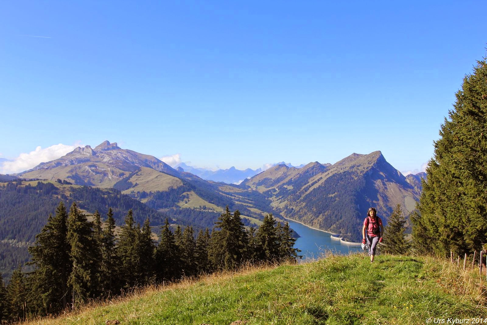 Wir waren wieder auf der Alpine Bike 1. Und diese folgt nun einem Wanderweg zum Lac de l’Hongrin hinunter. Oder ist es doch eher ein Bachbett? Jetzt erwachten die Jungs definitiv, jeder wollte der erste sein. Was nun folgte, ist nicht eine Schotterstrasse, wie man es von ausgeschilderten Bikerouten gewohnt ist, sondern Wurzeln, Absätze, Bollensteine, Schlamm, Dreck! Und natürlich musste ich im tiefsten Schlammloch absteigen, während die Jungs einfach durchflitzten. Am Ende dieses Trails schauten wir uns und die Bikes an: Alles war mit Dreck verspritzt. Heute war definitiv eine Dusche fällig. Wir fuhren zum Ufer des Lac de l’Hongrin, wo Fischer ihr Anglerglück versuchten. Bevor die Kinder wieder das halbe Ufer umgebaut hatten mit Strassen und Festungen, machten wir uns nach auf den Weg. Wir mussten wieder zur Strasse hoch, was nochmals einen zünftigen Aufstieg zur Folge hatte. Spannend war das nicht, einzig der Blick in die Schlucht war noch beeindruckend. Bald hatte sich der Kreis der Rundtour geschlossen. Der Jüngere war müde, er fuhr mit der Mutter nach La Lécherette, während der Ältere und ich nochmals über die Weiden und durch den Wald zurück zum Auto fuhren. In La Lécherette beschlossen wir die Tour mit einem Rivella und blinzelten zum Pic Chaussy rüber. Denn dort oben wollten wir am nächsten Tag stehen.
