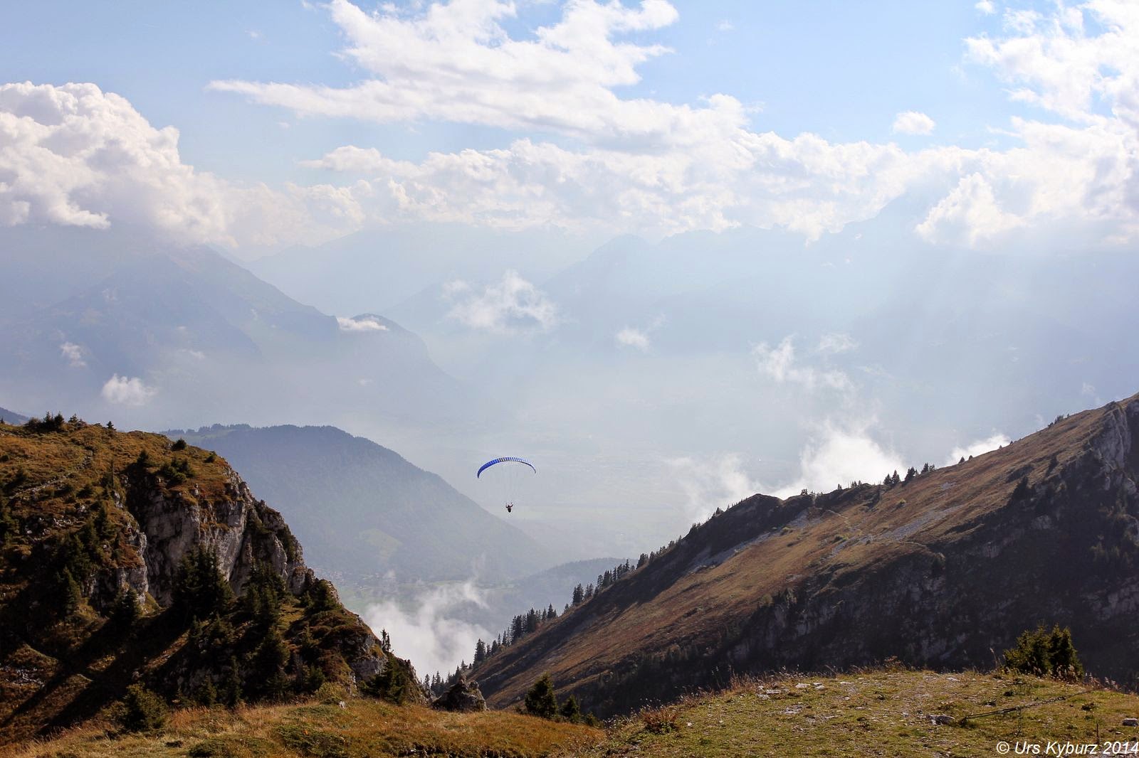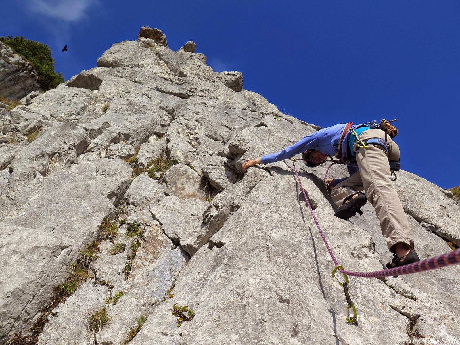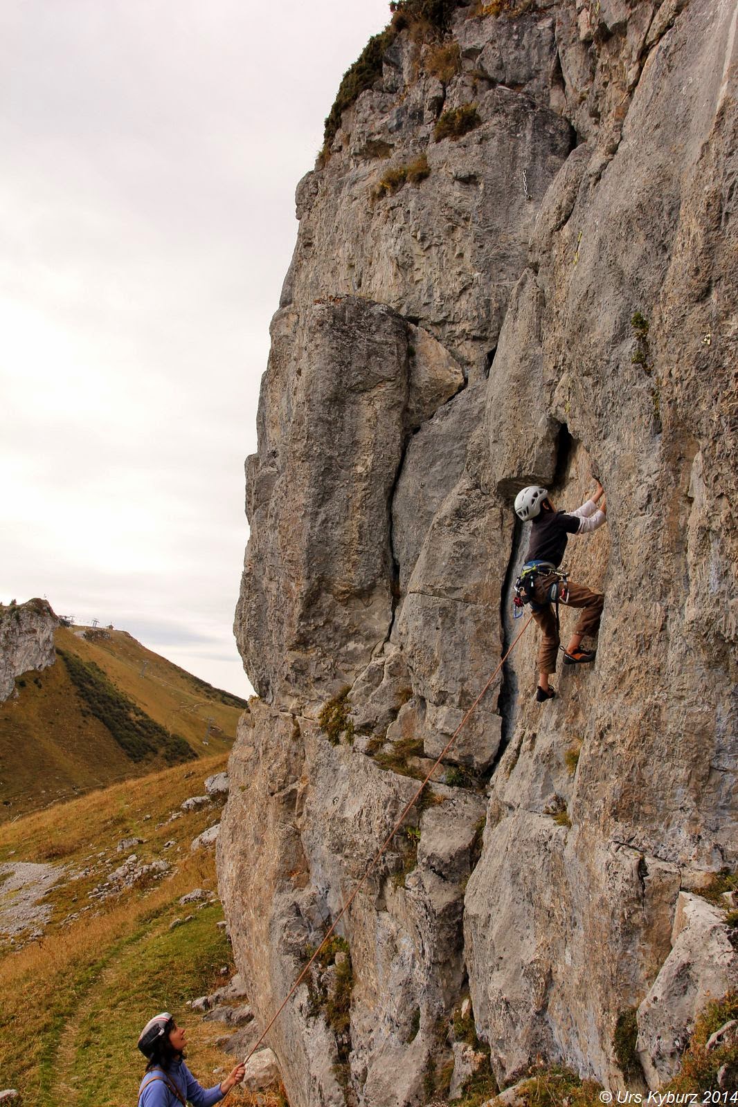 Von La Berneuse mussten wir zuerst wieder absteigen zum Lac d’Aï. Da heute Samstag war, war auch auf der Downhillpiste etwas los, so dass die Jungs ständig etwas zu schauen und kommentieren hatten. Wie wir schon ein paar Tage vorher festgestellt hatten, gab es ganz rechts ein paar Routen, die uns auf uns zugeschnitten schienen. Der Fels schien bombenfest und griffig zu sein, mich juckte es in den Fingern. Ich war entsprechend der erste, der parat war. In der Tat löste die erste Route bereits Hochgefühle aus, obwohl sie etwas schwieriger war, als ich sie von unten beurteilt hätte. Der Schein wurde zur Gewissheit: Die Klettereien sind ein Genuss hier. Nur in den einfachsten Routen trifft man auf etwas abgespeckte Griffe und Tritte. Frau und Junior 1 bestätigten meinen Eindruck. Die Frau wiederholte die gleiche Route, Junior 1 machte eine etwas einfachere. Trotzdem, auch bei der musste man die Hände zum Hosensack herausnehmen. Als eine ganze Gruppe Anfänger anmarschierte, verschoben wir uns in den nächsten Sektor. Junior 1 versuchte eine Route, gab dann aber auf. Ich beendete sie noch, ich hatte aber den Vorteil, dass ich einfach hochlangen konnte, während er klettern musste. Tja, die einen sind gross, die anderen können klettern. Die nächste (und bereits letzte) Route enthielt einen kleinen Überhang, so dass wir auch das wieder mal geübt hatten. Aber der erste Eindruck bestätigte sich auch bei der letzten Route: Abnormal griffig und fest, der Fels. Ganz ungewohnt für einen Jura-Kletterer. Beim Rückmarsch schaute ich mir nochmals die mächtigen Felswände an. Und geriet ins Träumen. Eines Tages…