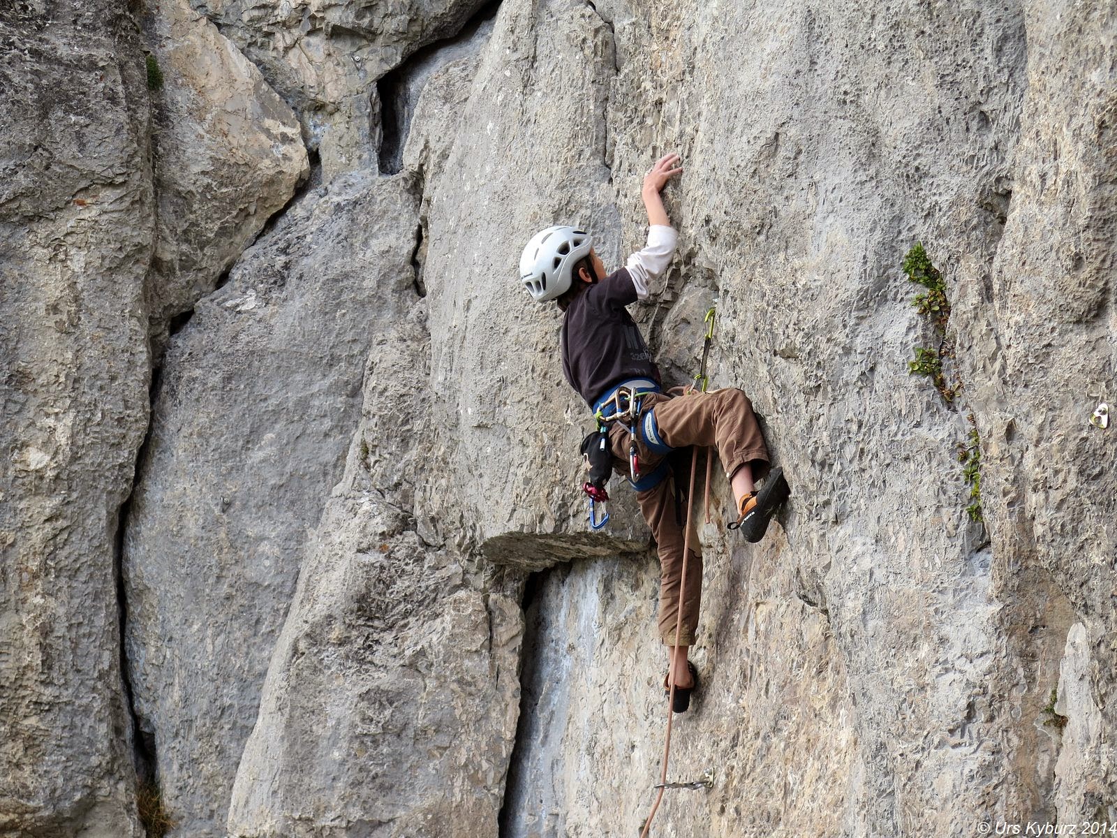 Tatsächlich kehrten wir eine Woche später wieder zurück, aber wieder an den gleichen Ort, nicht an die grossen Wände. Diesmal waren wir ganz alleine. Kein Wunder, bei den Temperaturen. Die Kinder waren voller Eifer und kletterten gleich los. Der eine kehrte bald um, weil er so kalte Finger hatte, der andere biss durch bis zur Umlenkung, hatte aber auch kalte Finger. Zum Glück wurde das Wetter immer besser, der Wind wurde weniger, so dass es doch noch angenehm wurde. Da gab es kein Halten mehr, Route um Route wurde geklettert. Leider war das (vorerst) unser letztes Abenteuer in Leysin.