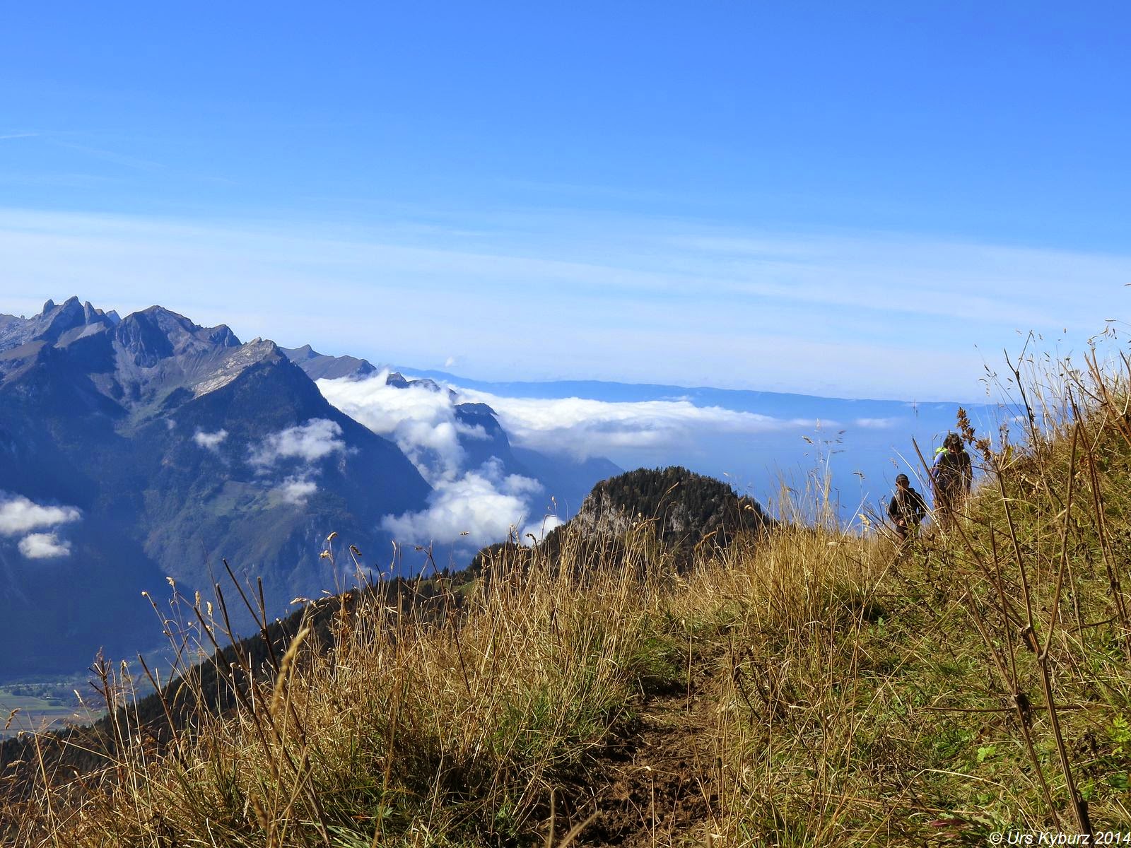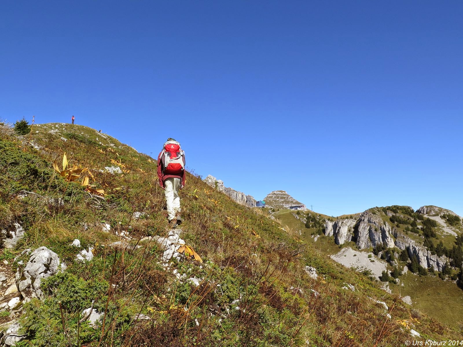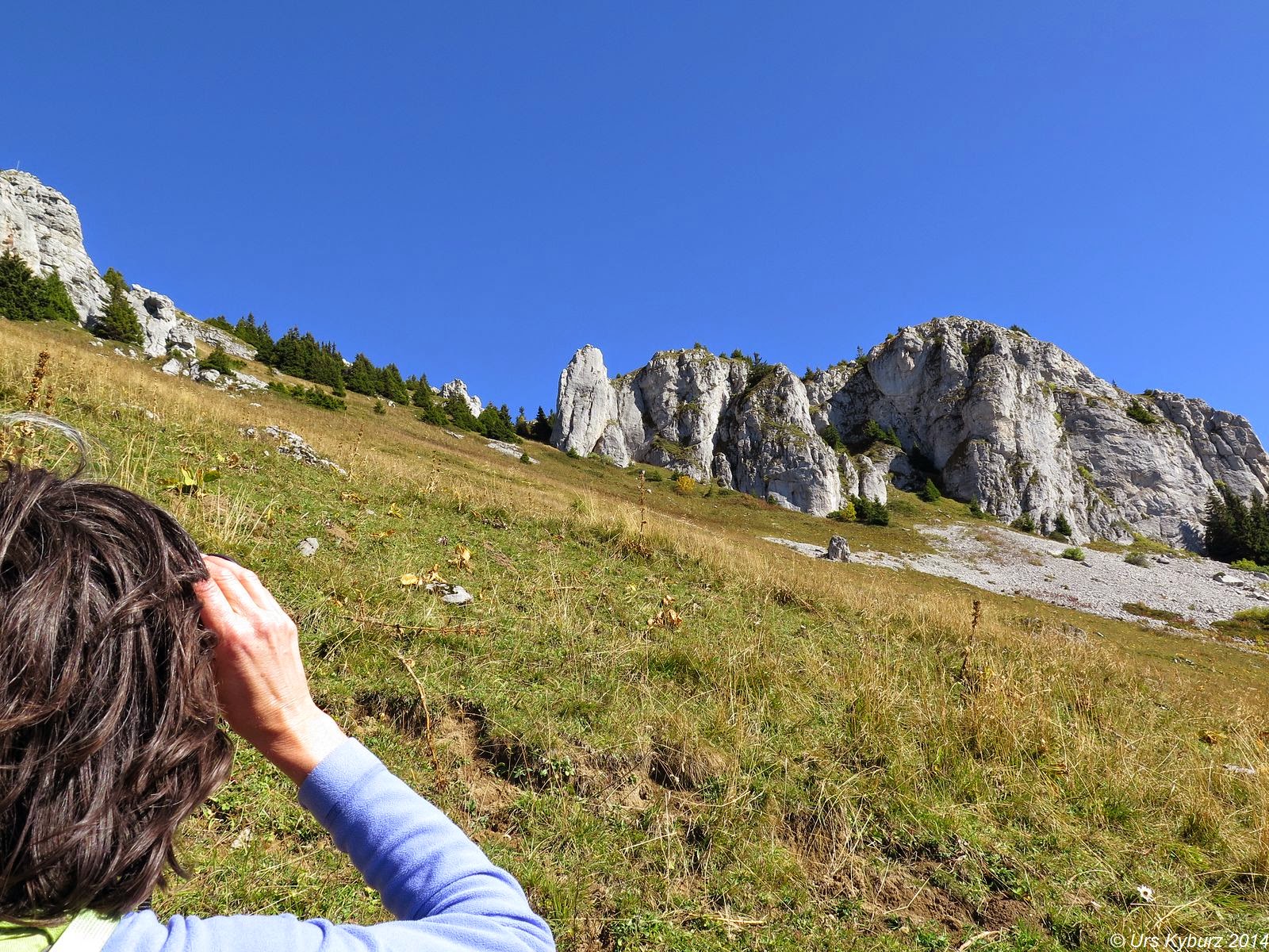 Junior 2 und ich kamen bald hinten ab, denn er wollte so viel wissen: Was für ein Pflanze ist. Und jene. Leider fanden wir in unserem Pflanzenbuch keine Antwort, dazu müsste man wohl den „Flora Helvetica“ mitschleppen, ein Monsterwälzer (ich weiss, es gibt ihn auch als App). Trotzdem erreichten auch wir zwei den Gipfel. Es windete, für einen gemütlichen Gipfelaufenthalt war es zu ungemütlich. Wir stiegen also bald wieder ab und suchten uns ein geschützteres Plätzchen zum Rasten. Hernach stiegen wir zum Col du Luissel ab, um sogleich die letzten 200 Höhenmeter in Angriff zu nehmen. Felswände in Sichtweite schienen zum Klettern einzuladen, und tatsächlich entdeckten wir mit dem Feldstecher ein paar nagelneue Bohrhaken. Auf der Berneuse endete dann unsere Tour, denn runter fuhren wir mit der Gondelbahn. Wie so Touristen.