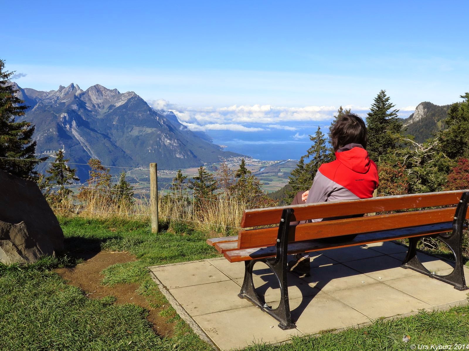 Nach dem Abstecher stiegen wir weiter von Tafel zu Tafel hoch bis zur elften und letzten. Der Pfad endete auf einem grossen Picknickplatz mit Tischen, Bänken und einer Brätelstelle. Und wir genossen eine grandiose Aussicht auf das Rhonetal und den Genfersee, der sich irgendwann im Dunst verlor. Wir waren mutterseelenalleine und genossen die Ruhe, an Wochenenden ist dieser Platz sicher jeweils überfüllt und lärmig.