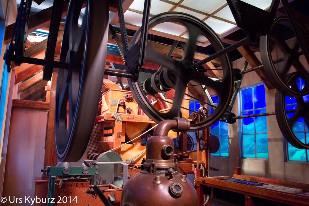 Und der Grund für den Halt in Broc? Das Maison Cailler, das Besucherzentrum der Schokoladenfabrik Cailler. Schon beim Weg vom Parkplatz zum Eingang stieg uns der Duft von Kakao in die Nase. Herrlich! Nach der Kasse kamen wir zuerst – natürlich – in den Fabrikladen. Rundum nur Schokolade! Wie soll man da widerstehen können? Zuerst begaben wir uns auf einen Rundgang. Wie auf einem Flughafen leuchtete auf einem Screen auf, wann man einchecken durfte, das heisst, wann der Rundgang startete. Von Station zu Station wurde uns die Geschichte der Schokolade näher gebracht.