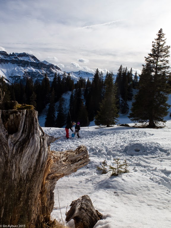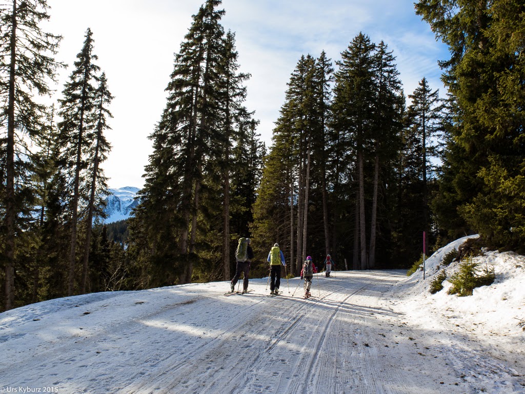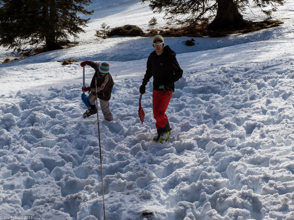 Wir folgten dem Winterwanderweg. Es war warm, Wasser floss über den Weg, wir mussten Pfützen durchqueren. Auf dem gemütlichen Weg konnten wir ausgiebig plaudern. Darob vergassen wir beinahe die Pause, unsere Kinder erinnerten uns aber daran. Nach der Stärkung war nun eine Lektion LVS-Suchen angesagt. Jeder suchte mindestens einmal ein Gerät, einige versuchten es mit zwei vergrabenen Geräten.