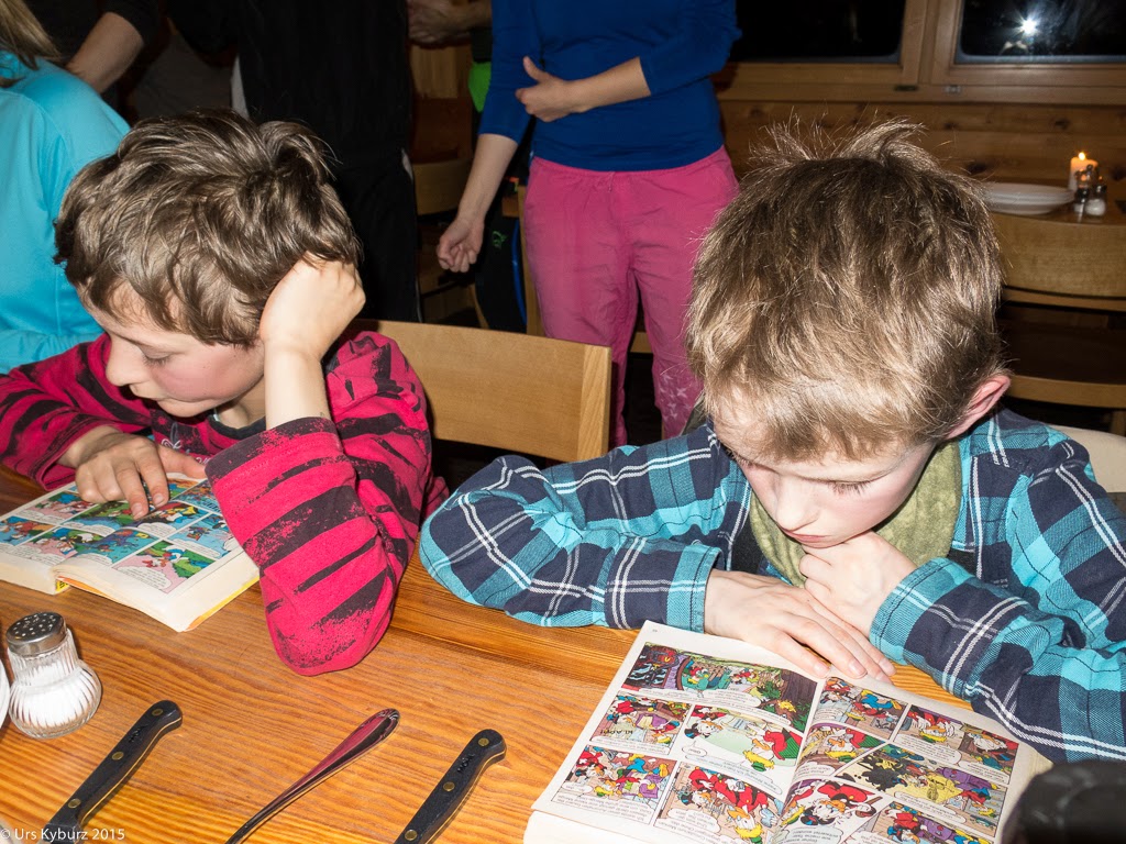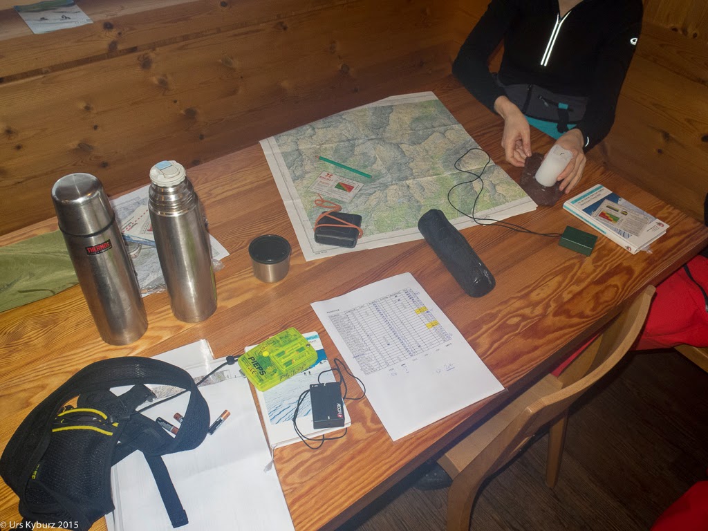 Es wurde immer dunkler, die Hütte war noch nicht in Sicht. Zum Glück markierten neonfarbene Pfosten den Weg. Immer, wenn wir dachten, nach der nächsten Kuppe kommt die Hütte, kam bloss die nächste Kuppe. Hier drängte sich eigentlich die berühmt-berüchtigte Kinderfrage "Ist es noch weit?" auf, aber nein, einfach weitermarschieren. Endlich leuchteten die Fenster der Spitzmeilenhütte in die Dunkelheit. Gutgelaunt betraten wir die Hütte und freuten uns aufs Essen. Eigentlich wäre noch ein Theorieblock angesagt gewesen, aber eine Gruppe fehlte noch. Kurz vor dem Nachtessen traf sie ein.