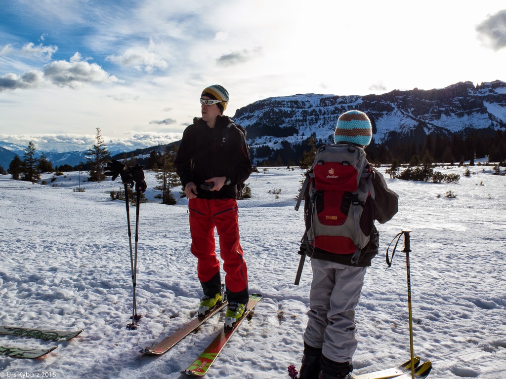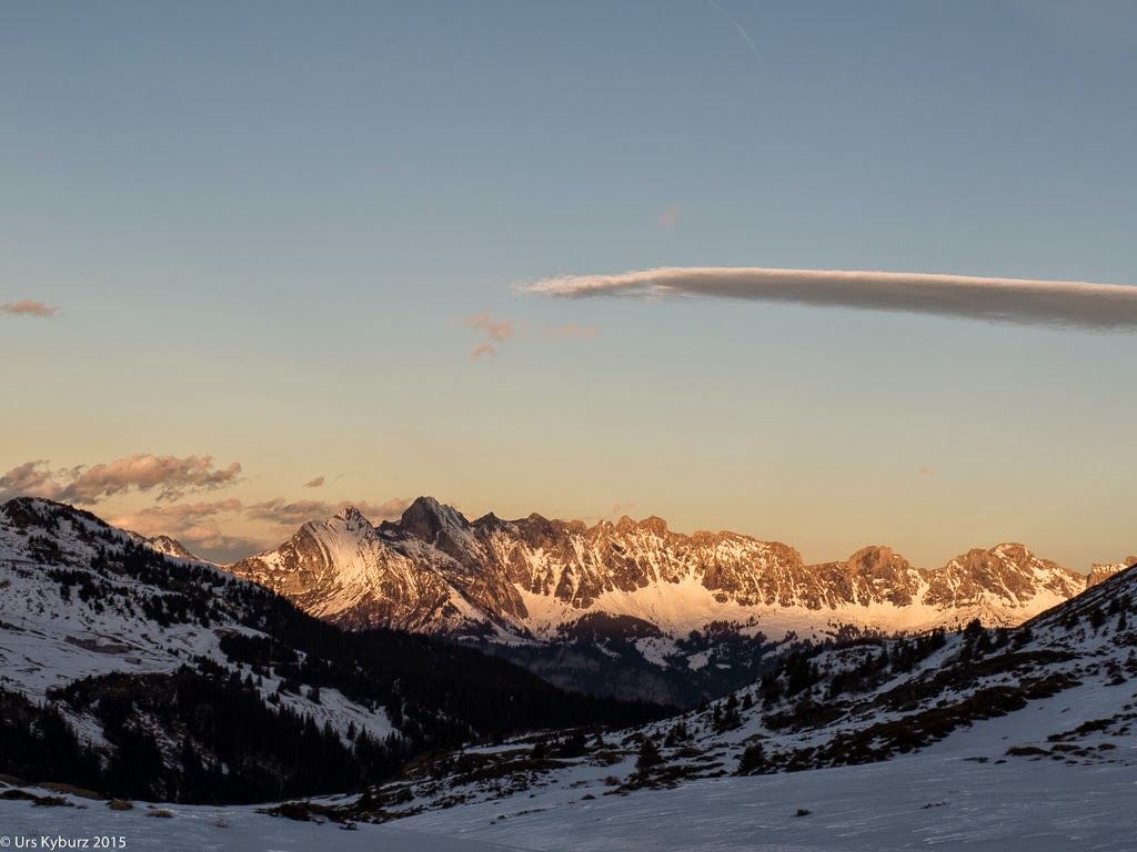 Weiter ging es nach Fursch, wo wir nochmals rasteten, bevor der Weg anstieg. Die Sonne war inzwischen verschwunden und beleuchtete nur noch die Berge der Alvierkette auf der anderen Talseite. Am Himmel bildeten sich immer neue Wolkenbilder, auch die irisierenden Wolken sahen wir, von denen es jede Menge Bilder auf dem Zwischennetz gab. Je höher wir stiegen, desto heftiger wurde Wind, bis er oben zum Sturm ausartete. Wir mussten immer wieder anhalten, um nicht umgeblasen zu werden. Trotzdem warfen Böen von über 100 km/h die Kinder ab und zu um. Ein Grund zum Jammern und Quengeln? Nein, nichts dergleichen. Stoisch ertrugen sie diese Naturgewalt.