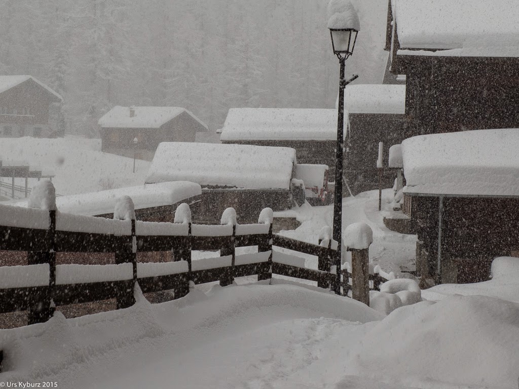 Immer wieder werden wir durch Böen durchgeschüttelt. Einmal sehe ich, wie eine Windhose genau auf meine Frau und den Älteren zusteuert. Faszinierend (gemacht hat es ihnen natürlich nichts). Nun wollen wir unseren Radius etwas ausdehnen und steigen auf Richtung Fafleralp, allerdings nur einige hundert Meter. Eine wunderbare, ruhige Landschaft. Lärchenwald, Berge, Schnee. Was will man mehr? Müde und glücklich kehren wir wieder zurück in unsere Wohnung.