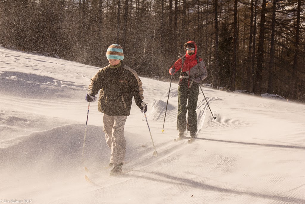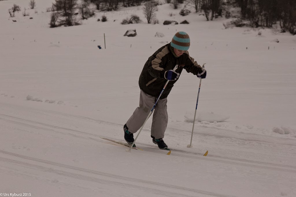 Am nächsten Tag treffen wir uns mit Martin, dem Langlauflehrer. Es schneit stark, eigentlich würde man da lieber am Cheminée in der Wärme bleiben und dem Schneegestöber zuschauen. Nicht so wir, wir freuen uns über die weisse Pracht. Wie bei jeder Sportart muss man sich zuerst aufwärmen. Mit Hin- und Hergleiten, Armen kreisen und Sprintübungen erreichen wir dieses Ziel. Er erklärt uns die Funktionsweise der Skis, die verschiedenen Techniken und so weiter. Aber genug der Theorie, wir wollen los. Gleiten, Diagonalschritt, Doppelstockschlag, alles wird geübt. "Ihr steht aber nicht wirklich das erste Mal auf Langlaufskis, oder?" fragt Martin. Äh, doch, zumindest die Kinder, und bei mir sind es auch schon zwanzig Jahre her, seit ich das letzte Mal auf schmalen Latten stand. Der Wind ist heute schwächer, dafür schneit es, so dass die Loipe schon bald zugedeckt ist.