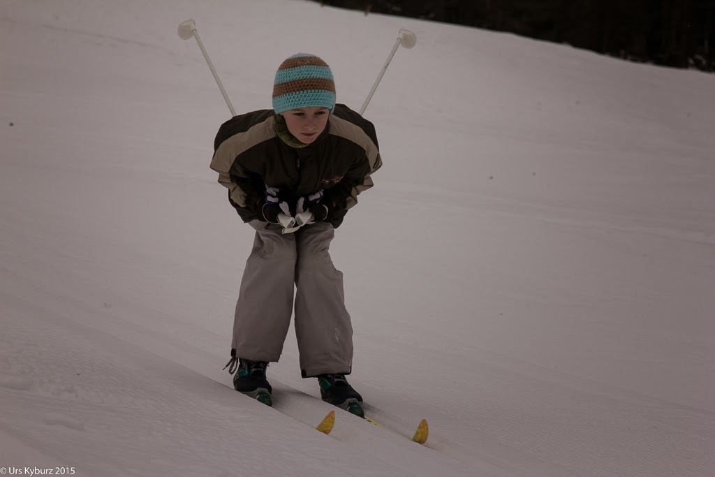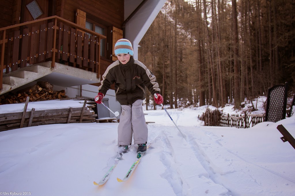In Steigungen muss man kürzere Schritte nehmen, damit der Ski im Schnee greift. Das haben die beiden schnell begriffen, besonders der Jüngere. Mit kleinen Tippelschritten erklimmt er jeden Anstieg spielend. Schon nach etwa einer Stunde sind wir wieder in unserer Wohnung. Die Kinder haben aber so Spass daran, dass sie noch ein paar Mal hinter dem Haus hoch steigen und wieder runter fahren, auch durch den tiefen Pulverschnee.