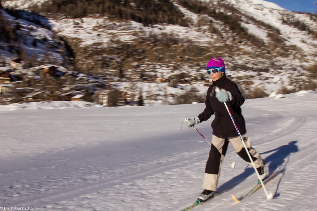 Nach zwei Stunden intensivem Langlauftraining ohne Pause ist es Zeit für das Mittagessen. Am Nachmittag laufen wir zu zweit bis Kühmatt, die Kinder sind ziemlich müde geworden. Da wir die Skis am gleichen Tag wieder zurückgeben müssen, machen wir anschliessend nochmals eine kleine Tour nach Wiler. Erstaunlich schnell sind wir wieder dort, das Training hat etwas gebracht.