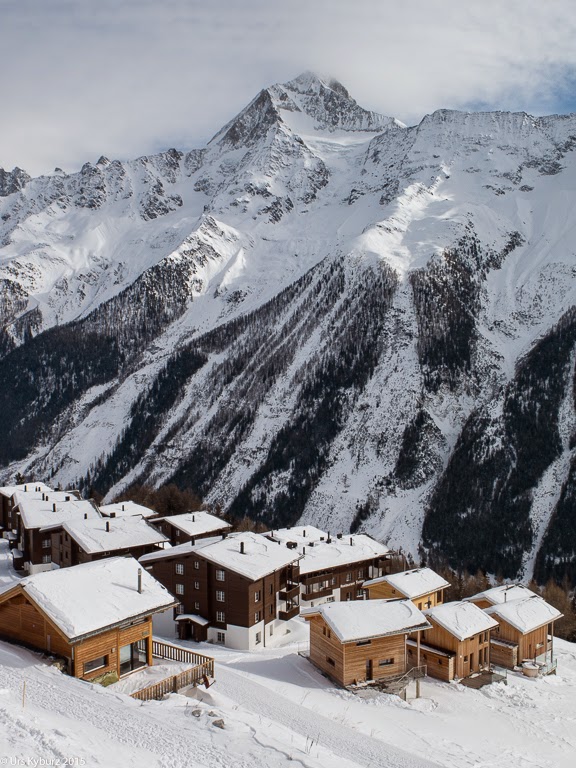 Die Skitouren fielen ja aus, aber zwei Tage gönnten wir uns auf der Piste. Wenn man die Lifte anschaut, hat man das Gefühl, es handle sich um ein kleines Skigebiet: Drei Lifte bis zuoberst, dazu noch zwei Bügellifte. Aber Pisten hat es jede Menge, vor allem anspruchsvolle. Für Anfänger ist das Gebiet nur bedingt geeignet, die bleiben am besten in der ersten Sektion. Es hat zwar zuoberst auch eine blaue Piste, in anderen Skigebieten wäre die aber bestimmt schon rot, und um wieder runter zu kommen, muss man eine schwarze Piste runter, ghoue oder gstoche. Und die ist doch ziemlich steil. Wer sich aber auf schwarzen Routen zu Hause fühlt, ist hier bestens bedient. Und die Aussicht ist grossartig: Vis-à-vis das gewaltige Bietschhorn, rechts davon viele Viertausender wie das wunderschöne Weisshorn (seufz!), die Dent Blanche oder das Matterhorn. Von der obersten Station aus sieht man auch auf die andere Seite ins Gasterental und frontal an die Rückseite von Doldenhorn, Fründenhorn und der Blüemlisalp.