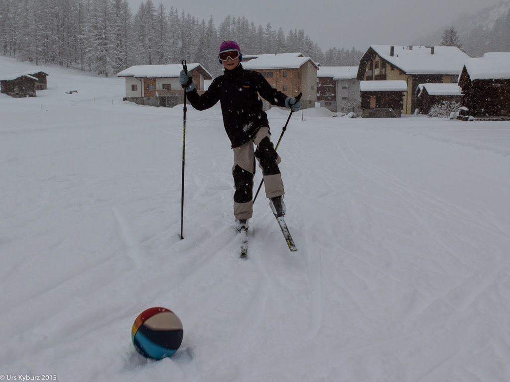 So melden wir uns am Mittwochabend bei Cécile Kalbermatten. Sie hat zusammen mit ihrem Mann das Material vom Langlaufzentrum Lötschental übernommen, das der bisherige Inhaber für alle ziemlich überraschend aufgegeben hat. Am nächsten Morgen schlafen wir zuerst einmal aus. Inzwischen hat es wieder angefangen zu schneien, und das nicht knapp. Die Räumungsfahrzeuge sind non-stopp unterwegs. Uns gefällt das natürlich, nun sieht man keine braunen Flecken mehr. Alles weiss! Das Dorf sieht jetzt zauberhaft aus, ein halber Meter Schnee liegt bereits auf den Dächern. Am Nachmittag treffen wir uns mit Cécile beim Skidepot. Die Skis sind bereits parat, exakt gemäss unseren Körpermassen, die wir tags zuvor angegeben haben, gewählt. Sie gibt uns noch verschiedene Tipps, denn auf Skatingskis stand von uns wirklich noch nie jemand. "Wisst ihr was, ich geh mich schnell umziehen, dann zeige ich euch ein paar Sachen". Ich staune immer mehr ob diesen Lötschentalern. Wir gehen nach draussen ins Schneegestöber und ziehen die Skis an. Und schon skaten die Jungs los. Mit den fünf Zentimeter Neuschnee auf der Loipe ist das nicht ganz einfach. Was auf Skitouren der Traum ist, ist beim Langlaufen eher hinderlich. Das tut unserer Motivation aber keinen Abbruch. Wir legen los, laufen so, wir denken, das man laufen sollte. Und es geht gar nicht so schlecht. Man kommt schneller voran als im klassischen Stil, ist aber auch kraftraubender. Cécile ist nun auch bereit und zeigt uns diverse Übungen.
