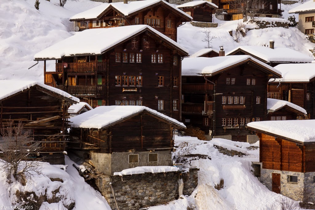 Das Dorf Blatten besteht hauptsächlich aus uralten Walliser Häusern, deren Holz schwarz geworden ist über die Jahrhunderte. Auch die neueren Bauten im Dorfkern wirken ziemlich authentisch und passen sich ins Dorfbild ein. Nur die Kirche... Na ja, Aber seht euch die Bilder am besten selber an.