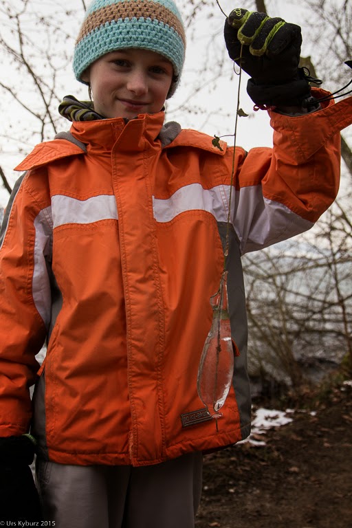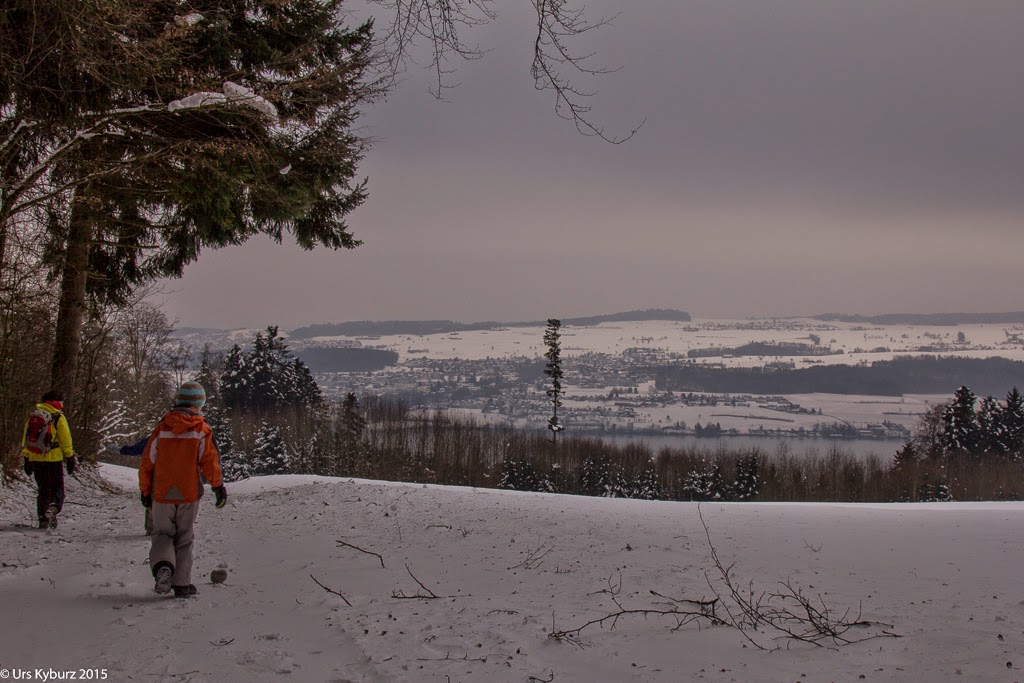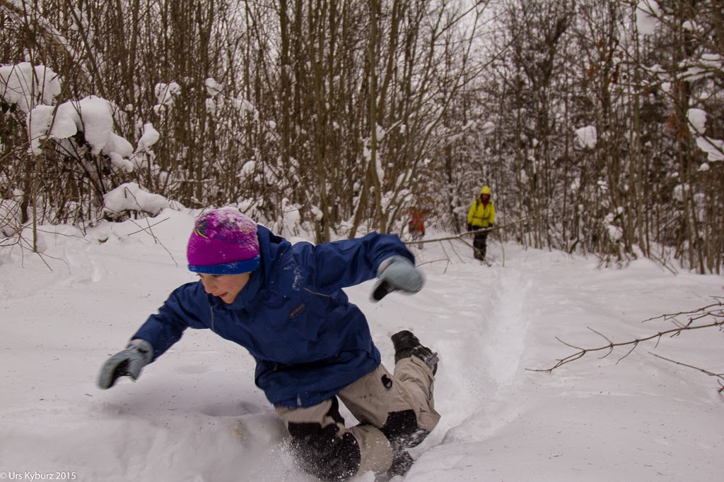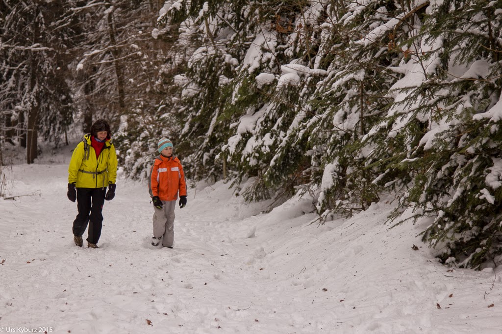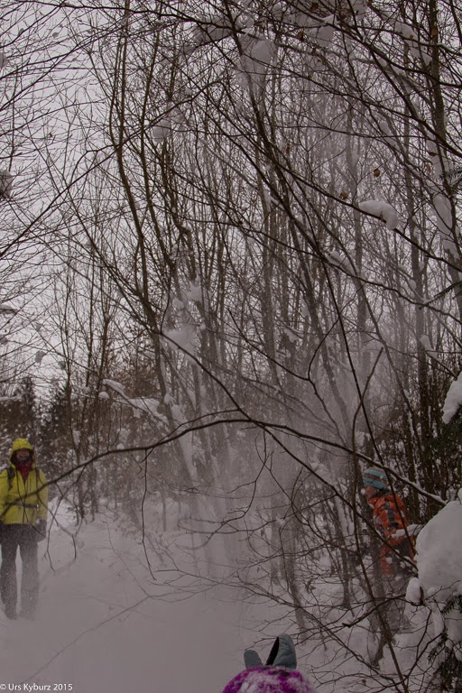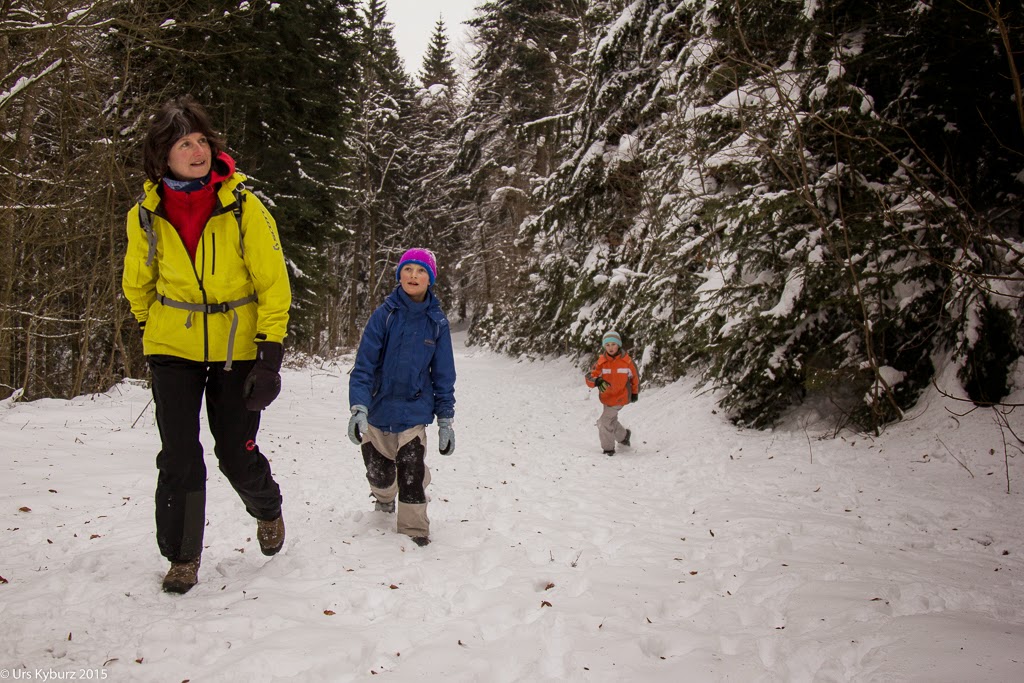 Wir haben keine Karte dabei, aber zum Glück gibt es ja heute diese elektronischen Helferlein, mit denen man sich auch orientieren kann. Da drauf entdecke ich einen schmalen Pfad, den wir dann auch wählen. Vor uns hüpfen Vögel im Geäst: Gimpel! Diese sieht man nur noch selten, umso erfreuter sind wir. Das Weglein entpuppt sich wieder als Spielwiese für die Kinder, sie versuchen, uns Hinterhalte zu legen und mit Schnee einzudecken.